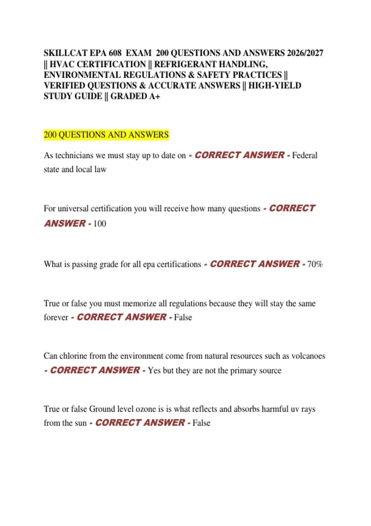 SKILLCAT EPA 608 EXAM 200 QUESTIONS AND ANSWERS 2026/2027 || HVAC CERTIFICATION || REFRIGERANT HANDLING, ENVIRONMENTAL REGULATIONS & SAFETY PRACTICES || VERIFIED QUESTIONS & ACCURATE ANSWERS || HIGH-YIELD STUDY GUIDE || GRADED A+ 200 QUESTIONS AND ANSWERS As technicians we must stay up to date on - CORRECT ANSWER - Federal state and local law
