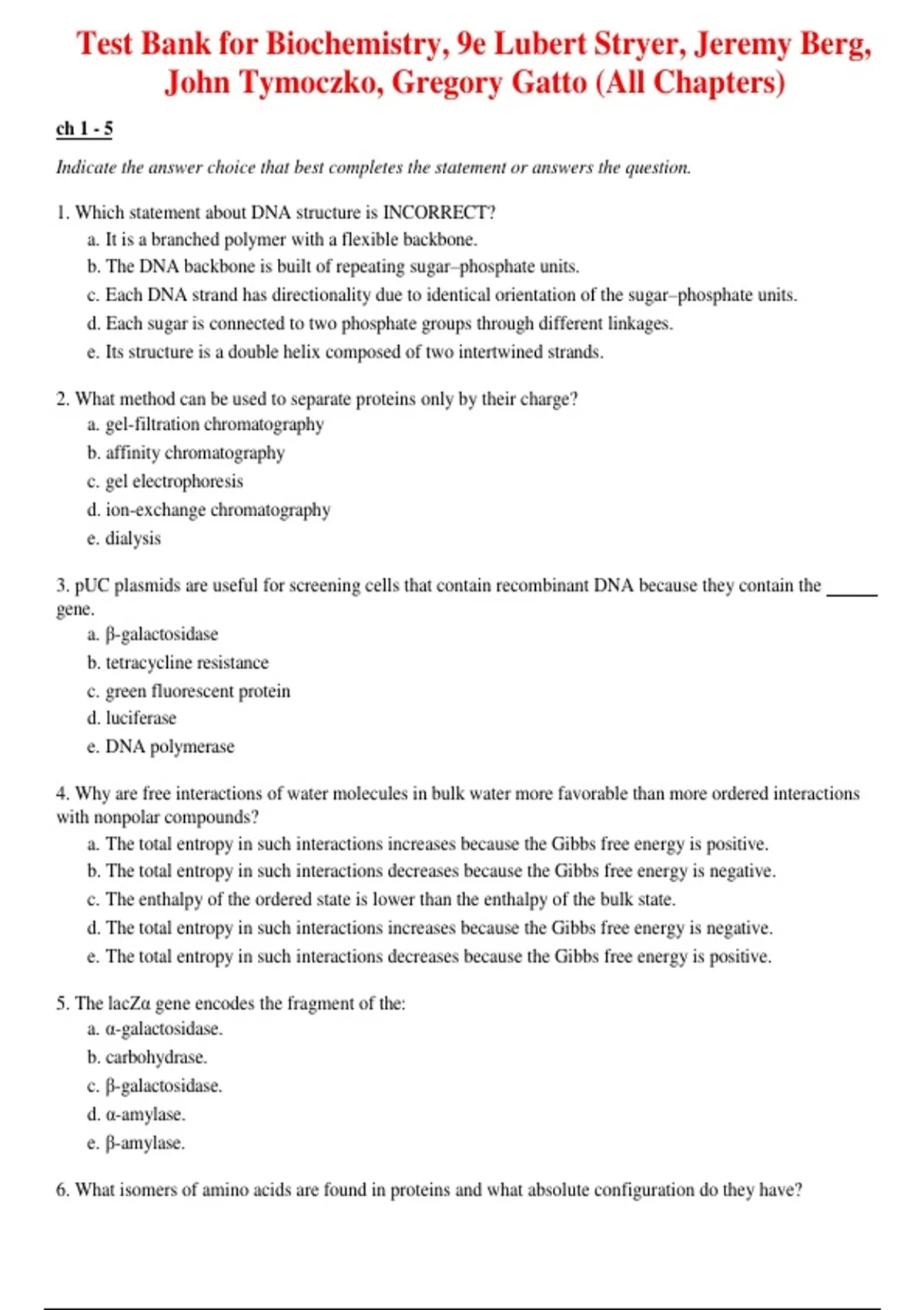 Ace your biochemistry exams with this comprehensive Test Bank for Biochemistry (9th Edition) by Lubert Stryer, Jeremy Berg, John Tymoczko, and Gregory Gatto — fully updated for 2026 exams. This test bank provides chapter-by-chapter questions and answers designed to reinforce essential biochemical concepts, including metabolism, enzymes, protein structure and function, molecular genetics, and more. Perfect for students seeking exam-focused practice, conceptual clarity, and higher scores. Ideal for: Exam preparation & revision Quiz & test practice Homework support & self-assessment Deepening understanding of biochemistry topics Structured for clarity and efficiency, this A+ graded resource is your ultimate study companion for mastering biochemistry.