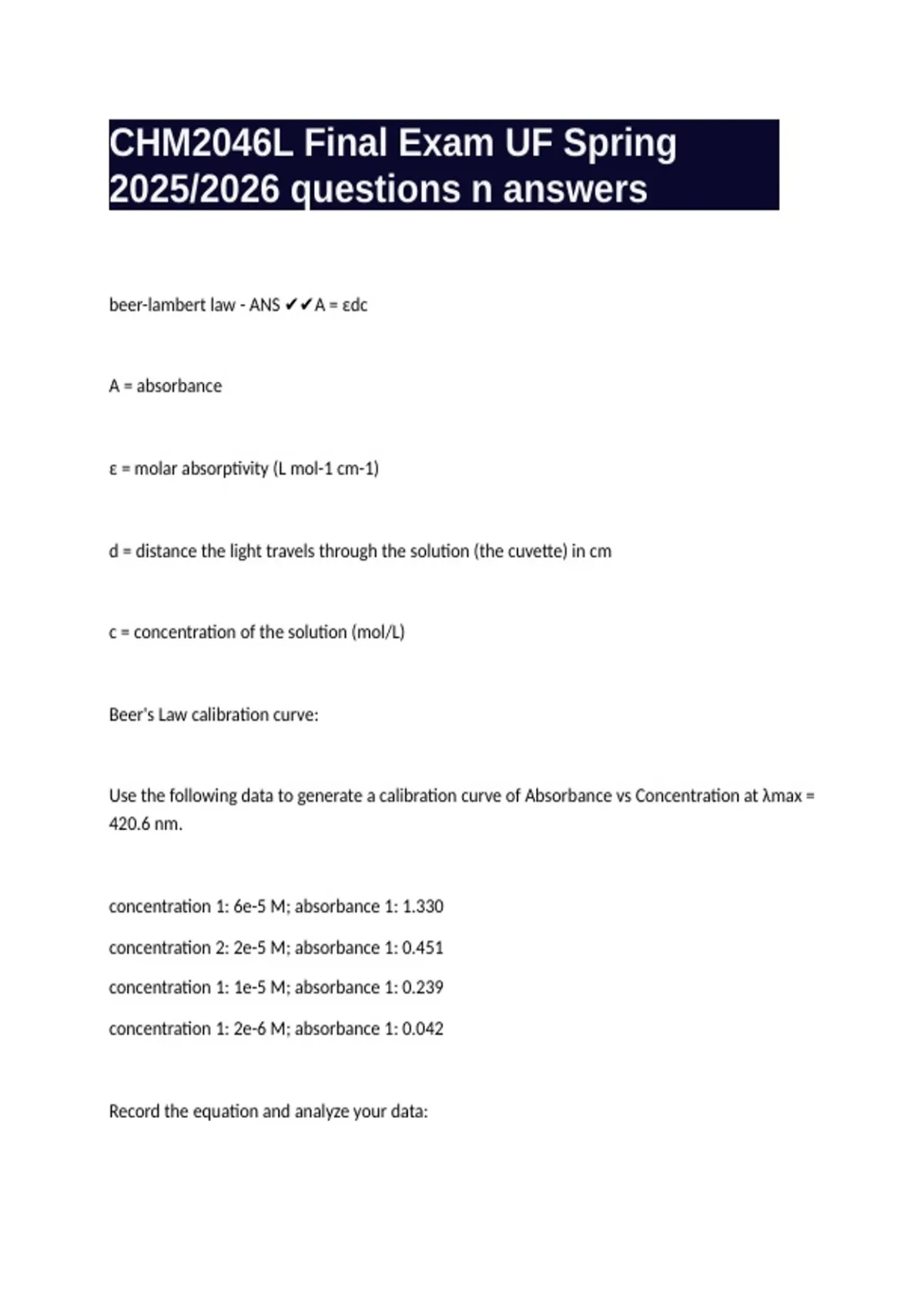 beer-lambert law - ANS ✔✔A = εdc