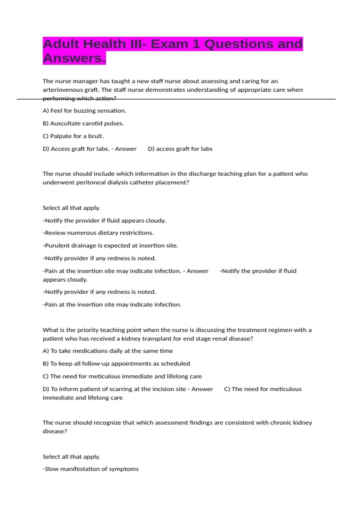 The nurse manager has taught a new staff nurse about assessing and caring for an arteriovenous graft. The staff nurse demonstrates understanding of appropriate care when performing which action? A) Feel for buzzing sensation. B) Auscultate carotid pulses. C) Palpate for a bruit. D) Access graft for labs. - Answer D) access graft for labs The nurse should include which information in the discharge teaching plan for a patient who underwent peritoneal dialysis catheter placement? Select all that apply. -Notify the provider if fluid appears cloudy. -Review numerous dietary restrictions. -Purulent drainage is expected at insertion site. -Notify provider if any redness is noted. -Pain at the insertion site may indicate infection. - Answer -Notify the provider if fluid appears cloudy. -Notify provider if any redness is noted. -Pain at the insertion site may indicate infection. What is the priority teaching point when the nurse is discussing the treatment regimen with a patient who has received a kidney transplant for end stage renal disease? A) To take medications daily at the same time B) To keep all follow-up appointments as scheduled C) The need for meticulous immediate and lifelong care D) To inform patient of scarring at the incision site - Answer C) The need for meticulous immediate and lifelong care The nurse should recognize that which assessment findings are consistent with chronic kidney disease? Select all that apply. -Slow manifestation of symptoms