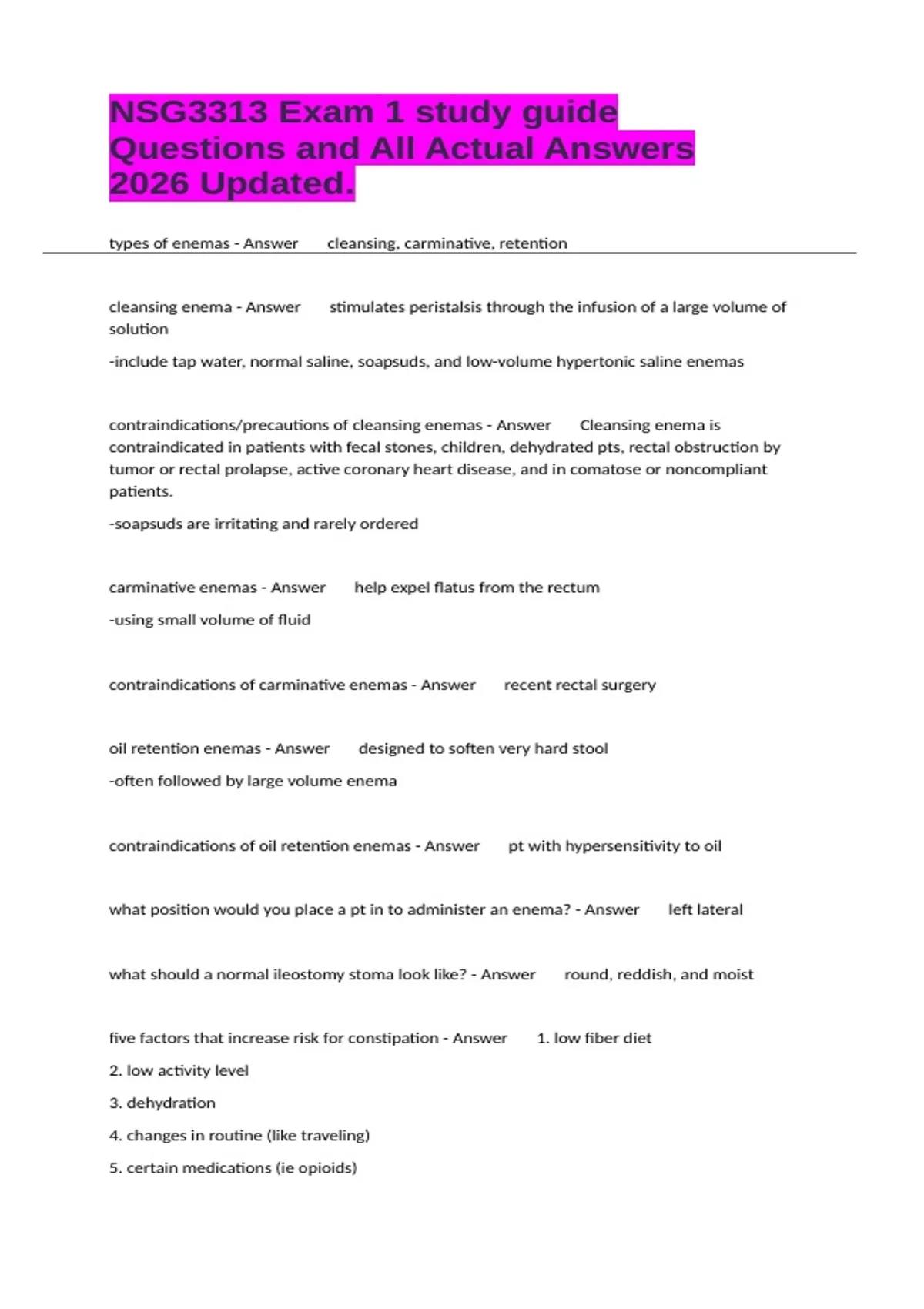 types of enemas - Answer cleansing, carminative, retention cleansing enema - Answer stimulates peristalsis through the infusion of a large volume of solution -include tap water, normal saline, soapsuds, and low-volume hypertonic saline enemas contraindications/precautions of cleansing enemas - Answer Cleansing enema is contraindicated in patients with fecal stones, children, dehydrated pts, rectal obstruction by tumor or rectal prolapse, active coronary heart disease, and in comatose or noncompliant patients. -soapsuds are irritating and rarely ordered carminative enemas - Answer help expel flatus from the rectum -using small volume of fluid contraindications of carminative enemas - Answer recent rectal surgery oil retention enemas - Answer designed to soften very hard stool -often followed by large volume enema contraindications of oil retention enemas - Answer pt with hypersensitivity to oil what position would you place a pt in to administer an enema? - Answer left lateral what should a normal ileostomy stoma look like? - Answer round, reddish, and moist five factors that increase risk for constipation - Answer 1. low fiber diet 2. low activity level 3. dehydration 4. changes in routine (like traveling) 5. certain medications (ie opioids)
