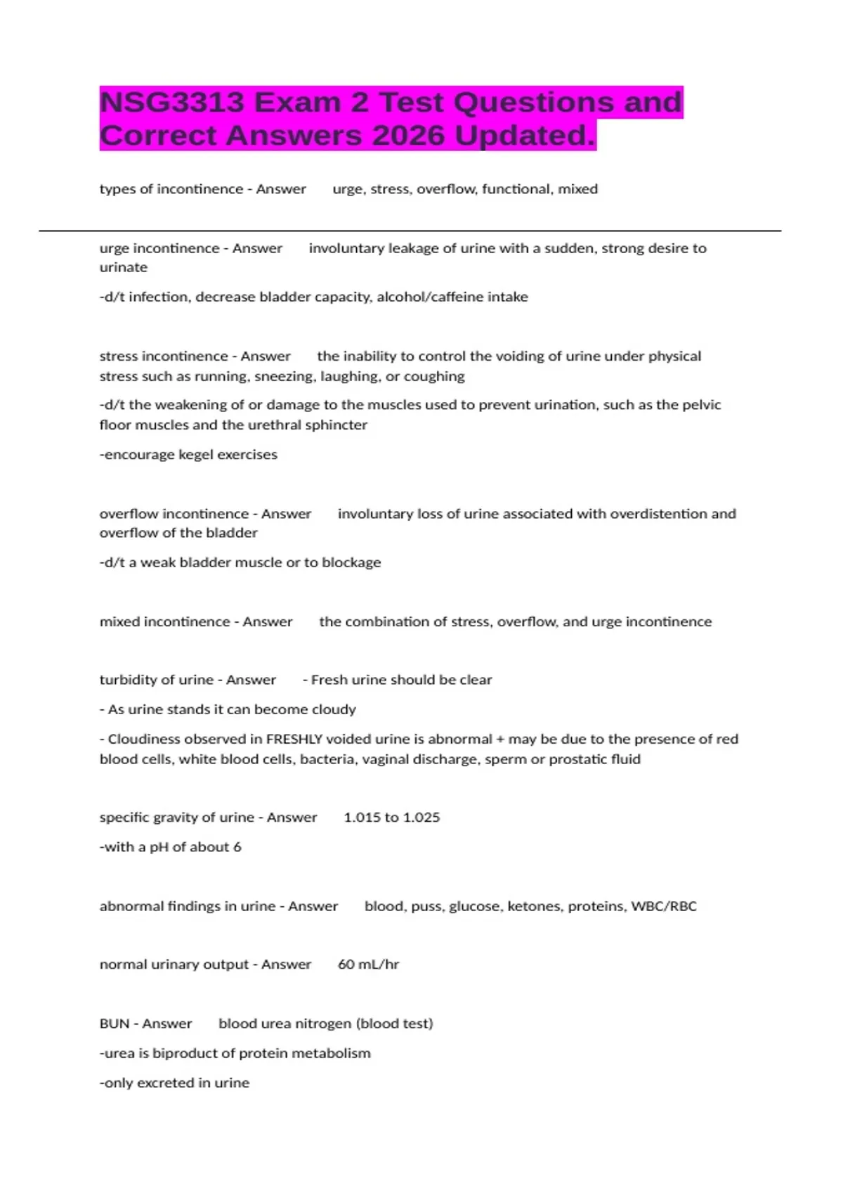 types of incontinence - Answer urge, stress, overflow, functional, mixed urge incontinence - Answer involuntary leakage of urine with a sudden, strong desire to urinate -d/t infection, decrease bladder capacity, alcohol/caffeine intake stress incontinence - Answer the inability to control the voiding of urine under physical stress such as running, sneezing, laughing, or coughing -d/t the weakening of or damage to the muscles used to prevent urination, such as the pelvic floor muscles and the urethral sphincter -encourage kegel exercises overflow incontinence - Answer involuntary loss of urine associated with overdistention and overflow of the bladder -d/t a weak bladder muscle or to blockage mixed incontinence - Answer the combination of stress, overflow, and urge incontinence turbidity of urine - Answer - Fresh urine should be clear - As urine stands it can become cloudy - Cloudiness observed in FRESHLY voided urine is abnormal + may be due to the presence of red blood cells, white blood cells, bacteria, vaginal discharge, sperm or prostatic fluid specific gravity of urine - Answer 1.015 to 1.025 -with a pH of about 6 abnormal findings in urine - Answer blood, puss, glucose, ketones, proteins, WBC/RBC normal urinary output - Answer 60 mL/hr BUN - Answer blood urea nitrogen (blood test) -urea is biproduct of protein metabolism -only excreted in urine