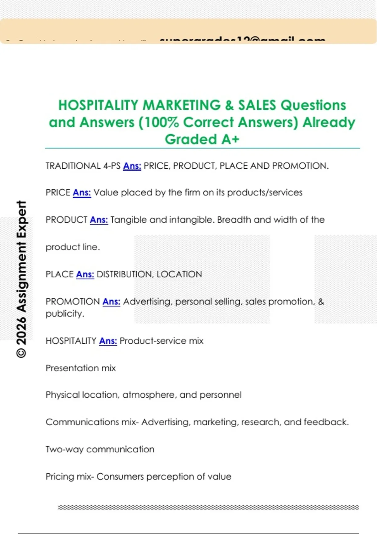 HOSPITALITY MARKETING & SALES Questions and Answers (100% Correct Answers) Already Graded A+