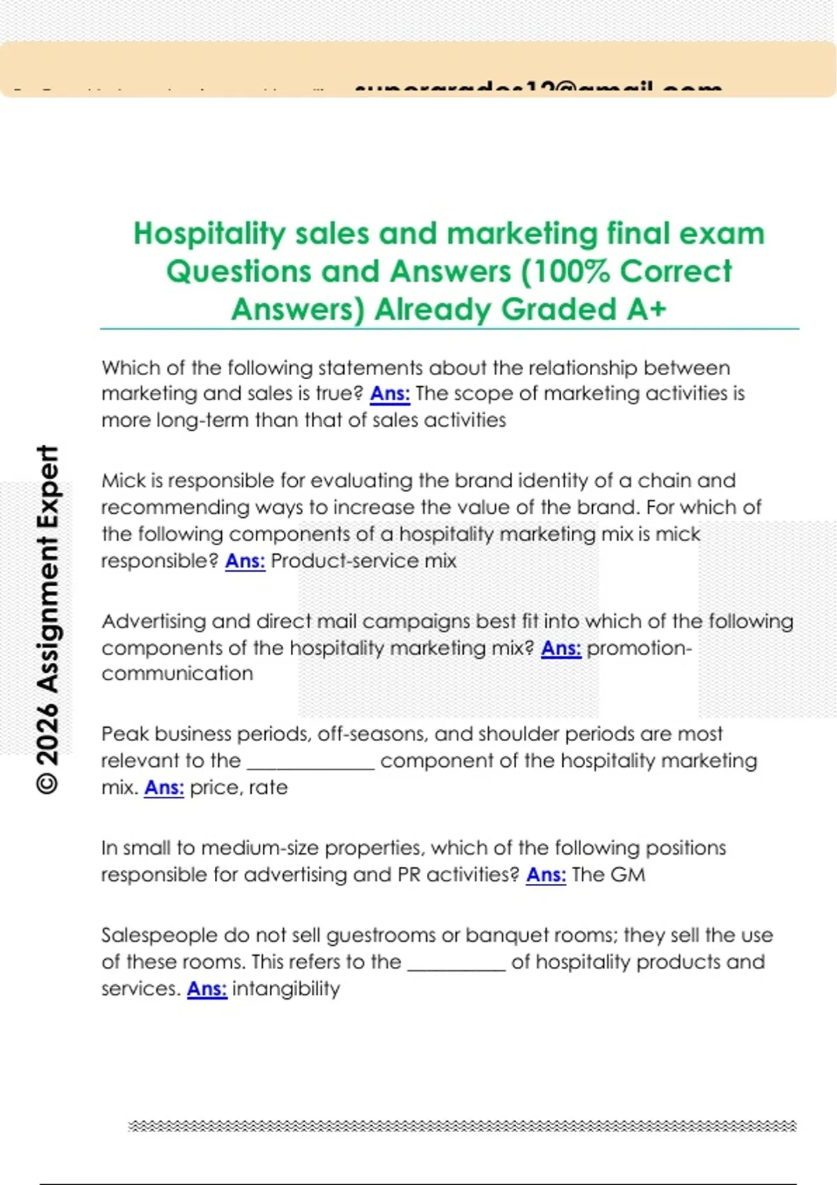 Hospitality sales and marketing final exam Questions and Answers (100% Correct Answers) Already Graded A+