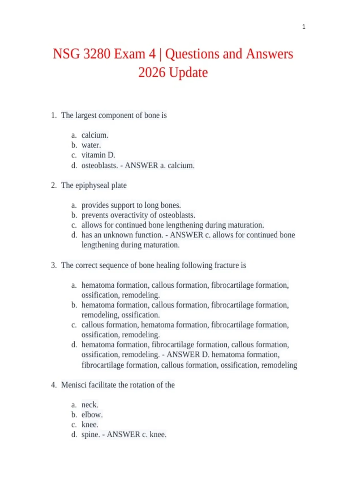 NSG 3280 Exam 4 | Questions and Answers 2026 Update 1. The largest component of bone is a. calcium. b. water. c. vitamin D. d. osteoblasts. - ANSWER a. calcium. 2. The epiphyseal plate a. provides support to long bones. b. prevents overactivity of osteoblasts. c. allows for continued bone lengthening during maturation. d. has an unknown function. - ANSWER c. allows for continued bone lengthening during maturation. 3. The correct sequence of bone healing following fracture is a. hematoma formation, callous formation, fibrocartilage formation, ossification, remodeling. b. hematoma formation, callous formation, fibrocartilage formation, remodeling, ossification. c. callous formation, hematoma formation, fibrocartilage formation, ossification, remodeling. d. hematoma formation, fibrocartilage formation, callous formation, ossification, remodeling. - ANSWER D. hematoma formation, fibrocartilage formation, callous formation, ossification, remodeling 4. Menisci facilitate the rotation of the a. neck. b. elbow. c. knee. d. spine. - ANSWER c. knee. 5. Radicular pain is pain caused by a a. tissue injury. b. compressed nerve. c. fracture of long bones. d. meniscal tear. - ANSWER b. compressed nerve. 6. It is true that synovial fluid a. is found in spinal disks. b. provides protection. c. is reduced in volume with injury. d. becomes thinner with aging. - ANSWER b. provides protection. 7. The structures that connect muscle to bone are referred to as a. ligaments. b. tendons. c. trabeculae. d. synovial sheaths. - ANSWER b. Tendons 8. The electrolyte that must be present in cellular cytoplasm for muscle contraction to occur is a. potassium. b. sodium. c. Magnesium d. calcium - ANSWER d. calcium 9. The organism most commonly associated with pelvic inflammatory disease is: a. Neisseria gonorrhoeae. b. Treponema pallidum. c. Escherichia coli. d. Pseudomonas. - ANSWER a. Neisseria gonorrhoeae 10. A long asymptomatic latent phase is characteristic of which of the following sexually transmitted infections? a. Gonorrhea b. Syphilis c. Chlamydia d. Hepatitis B - ANSWER b. Syphilis 11. A painless ulceration called a chancre is a lesion associated with infection by: a. human papillomavirus. b. N. gonorrhoeae. c. C. trachomatis. d. T. pallidum. - ANSWER d. T. pallidum. 12. Which infection can be a risk factor for cervical cancer? a. Human papillomavirus b. Molluscum contagiosum c. Granuloma inguinale d. Chancroid - ANSWER a. Human papillomavirus 13. Which of the following infections is asymptomatic and self-limited and does not require therapy? a. Syphilis b. Nongonococcal cervicitis c. Gonorrhea d. Molluscum contagiosum - ANSWER d. Molluscum contagiosum 14. The first choice of treatment for the management of syphilis is: a. penicillin G. b. doxycycline. c. antiviral agents. d. antimicrobial agents. - ANSWER a. penicillin G. 15. A 23-year-old male presents with urethritis, dysuria, and purulent urethral discharge. The suspected diagnosis would be: a. gonorrhea. b. urinary tract infection. c. Chlamydia. d. syphilis. - ANSWER a. gonorrhea.