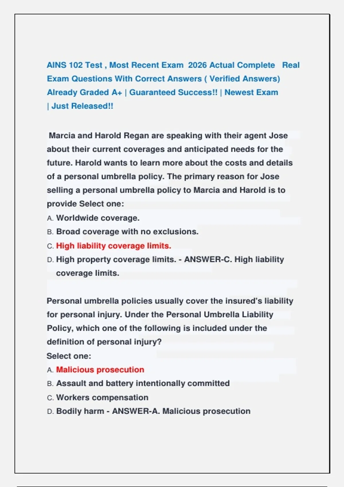 D. High property coverage limits. - ANSWER-C. High liability