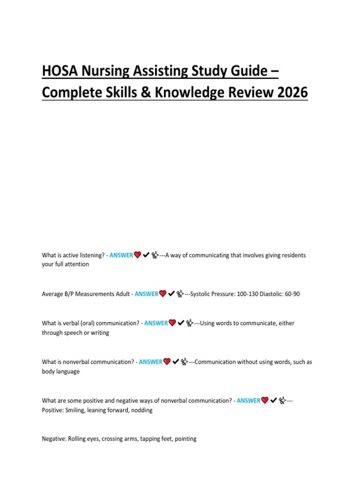 Comprehensive 2026 HOSA Nursing Assisting study guide covering essential nursing assistant skills and knowledge. Includes patient care techniques, vital signs, infection control, clinical procedures, professional communication, and personal qualities. Features practice exercises, scenarios, and tips to help students excel in HOSA competitions and clinical assessments.