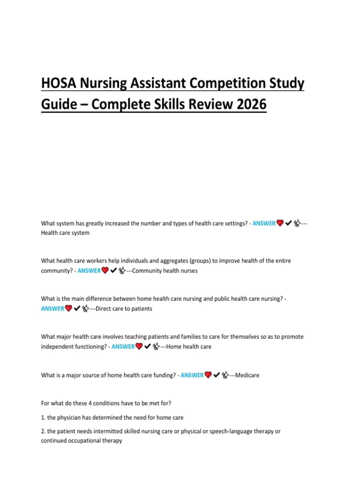 Comprehensive 2026 HOSA Nursing Assistant competition study guide. Covers essential skills including vital signs, hygiene, mobility, infection control, patient care techniques, and clinical procedures. Includes practice scenarios, step-by-step walkthroughs, and tips to help students excel in HOSA competitions and assessments.