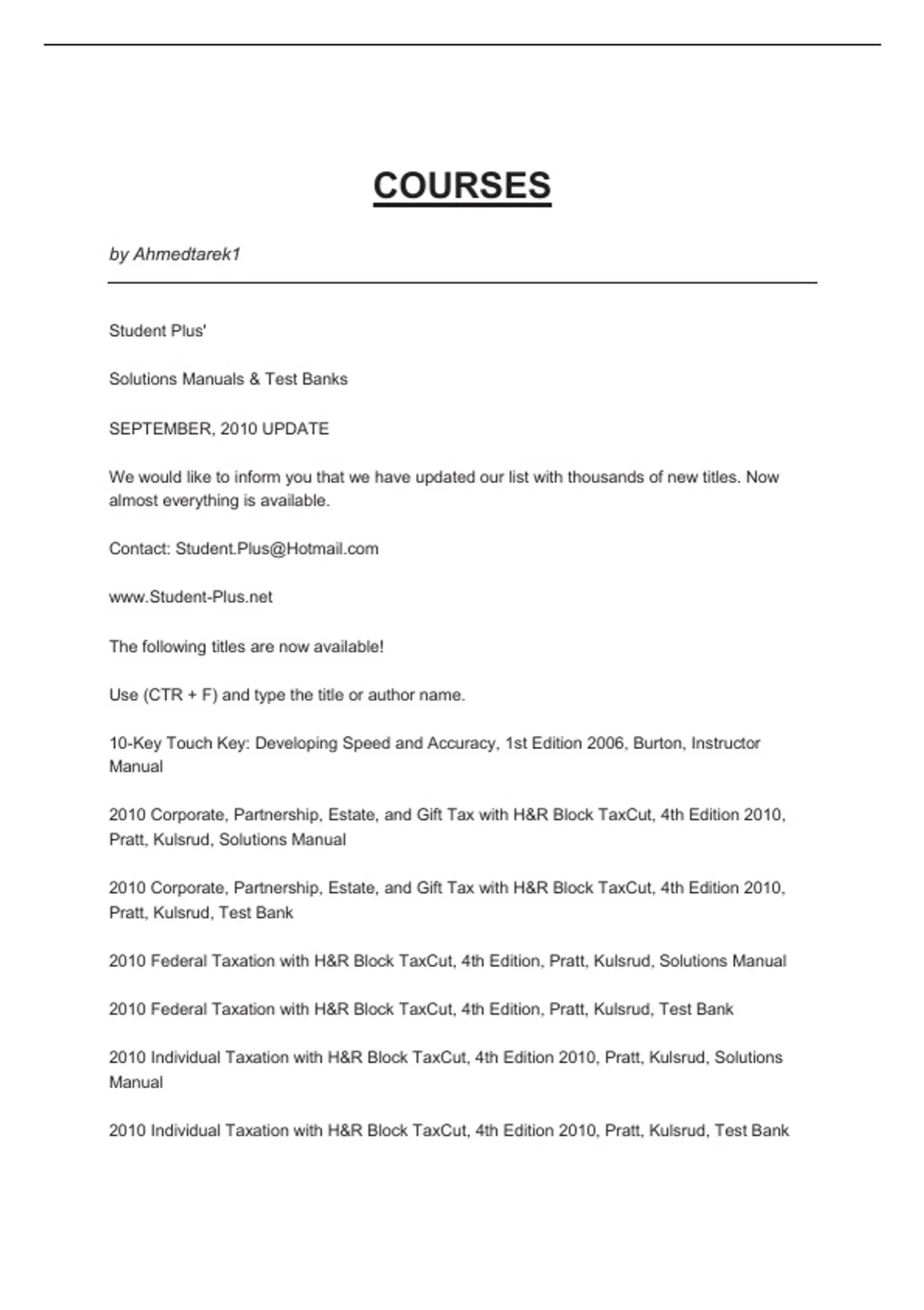 2010 Individual Taxation with H&R Block TaxCut, 4th Edition 2010, Pratt, Kulsrud, Test Bank