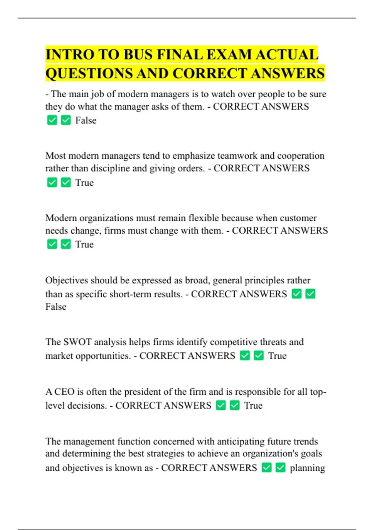 INTRO TO BUS FINAL EXAM ACTUAL QUESTIONS AND CORRECT ANSWERS