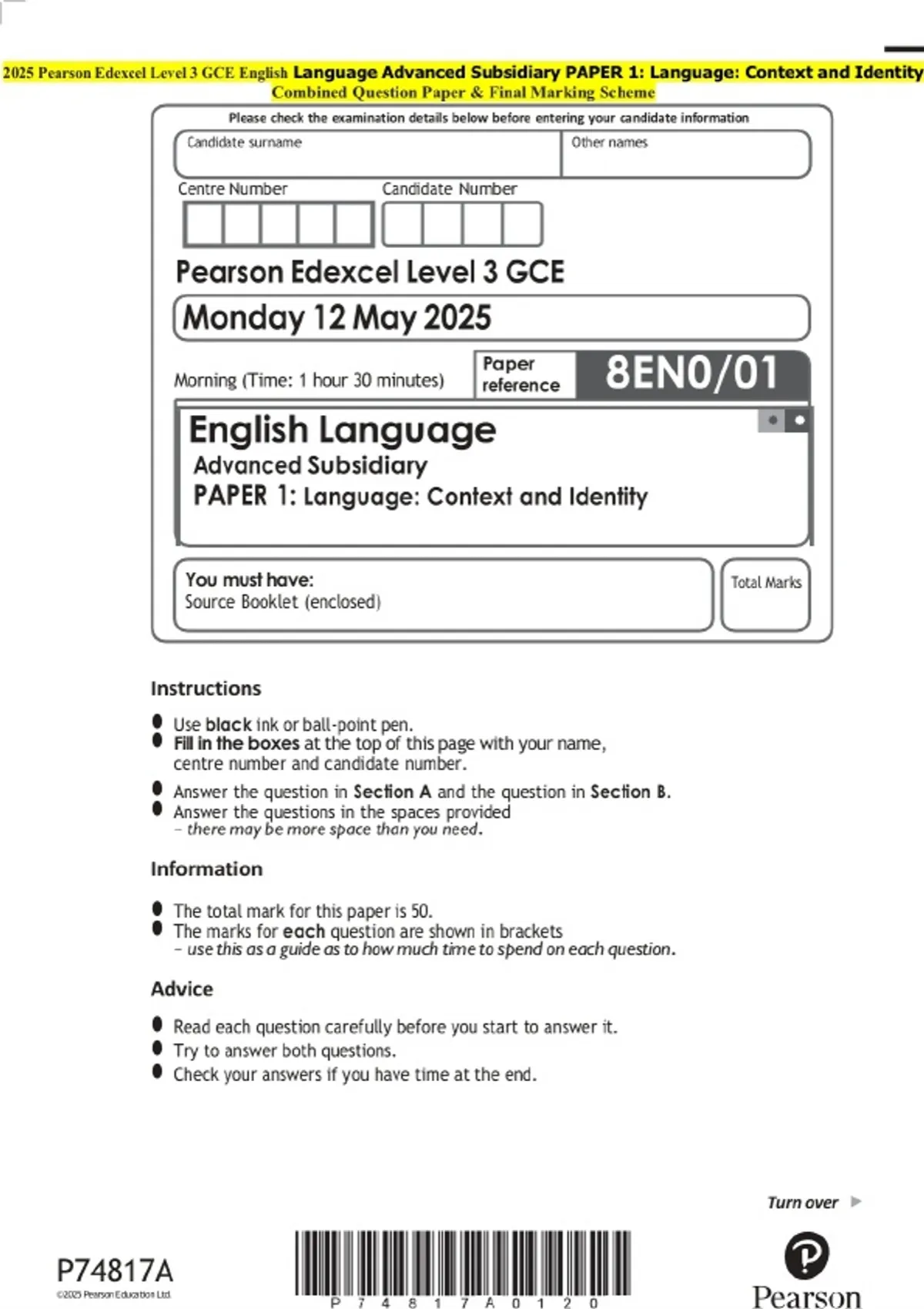 2025 Pearson Edexcel Level 3 GCE English Language Advanced Subsidiary PAPER 1: Language: Context and Identity Question Paper with Final Marking Guide