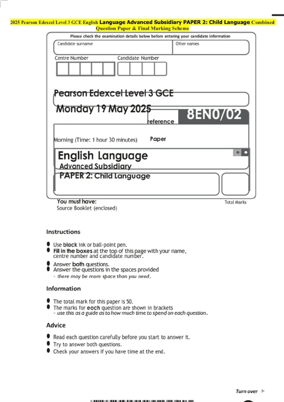 2025 Pearson Edexcel Level 3 GCE English Language Advanced Subsidiary PAPER 2: Child Language Question Paper with Final Marking Guide