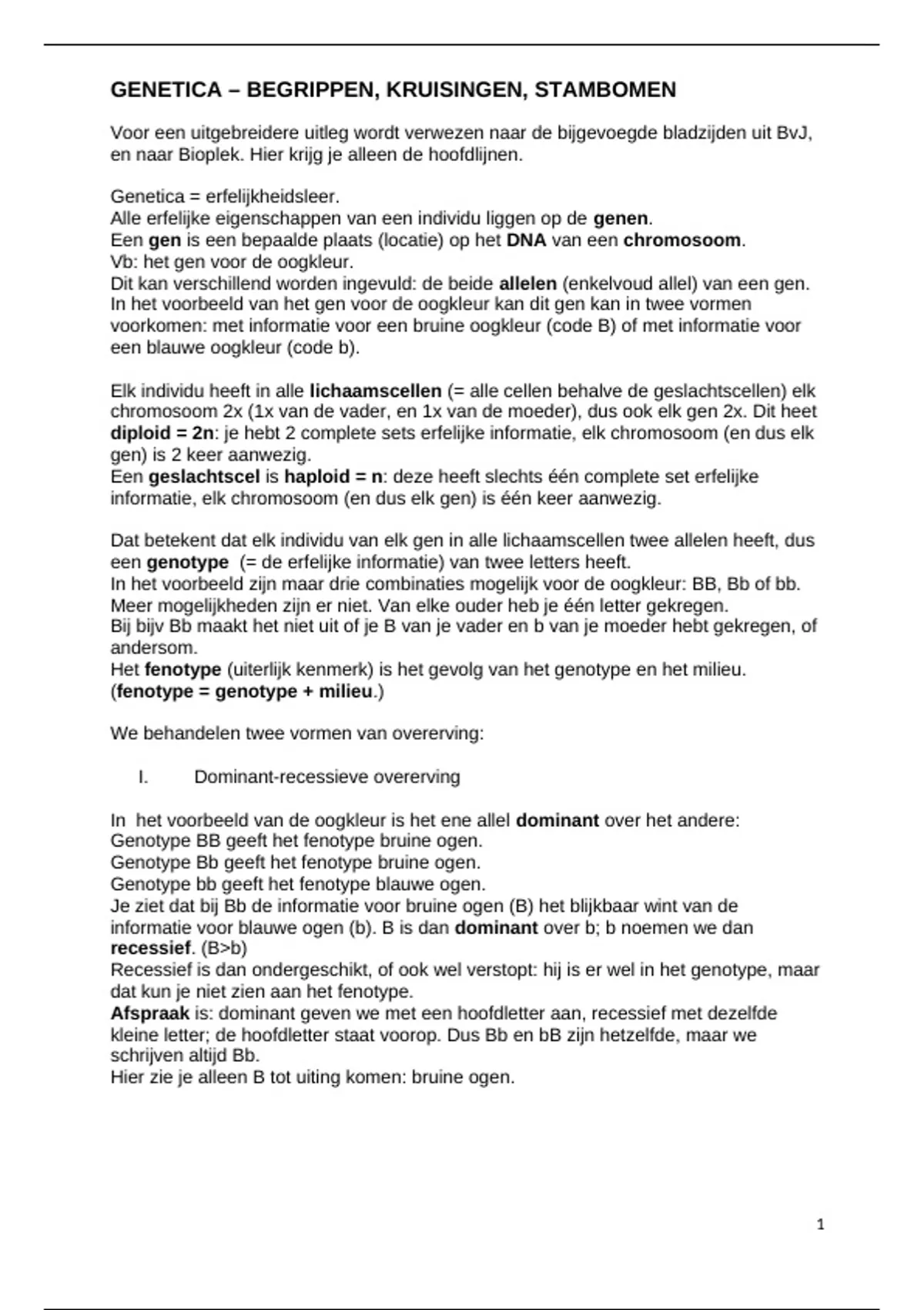 In het document staan begrippen van het onderwerp genetica voor de tweede klas VWO. Ook worden kruisingen en stambomen behandeld. Verder is het document aangevuld met een set van 22 oefenvragen.
