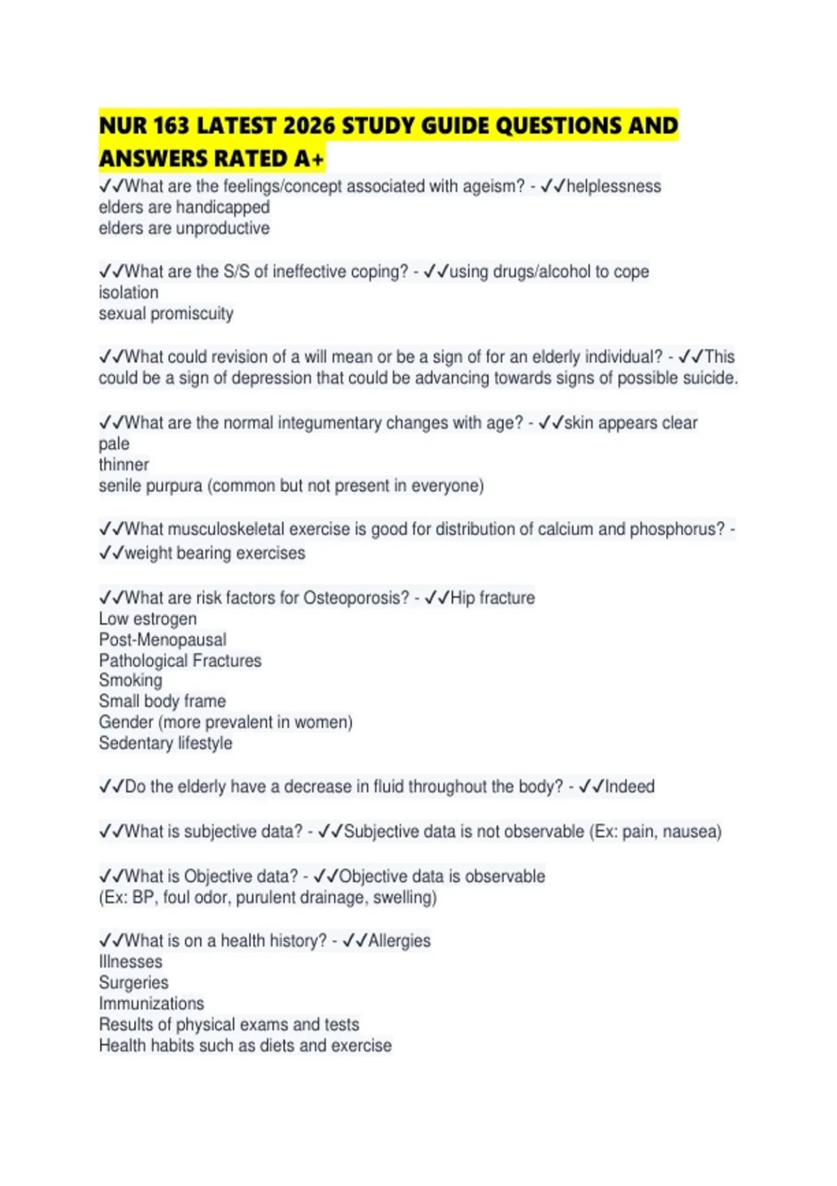 NUR 163 LATEST 2026 STUDY GUIDE QUESTIONS AND ANSWERS RATED A+