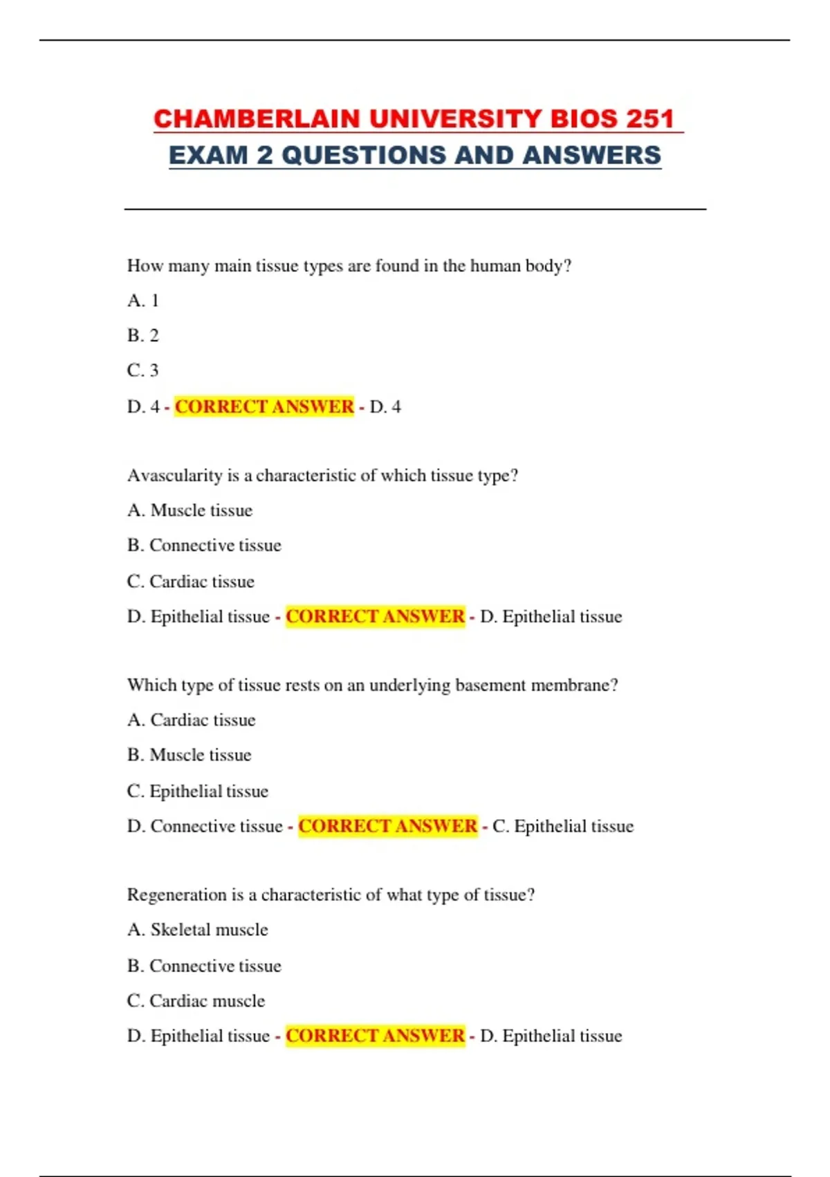 This document contains a detailed collection of BIOS 251 Exam 2 practice questions with correct answers, focusing on tissues, cell structure, membranes, transport mechanisms, organelles, metabolism, and the cell cycle. It serves as a thorough study guide aligned with Chamberlain University’s Anatomy and Physiology II curriculum, ideal for exam preparation and concept reinforcement.