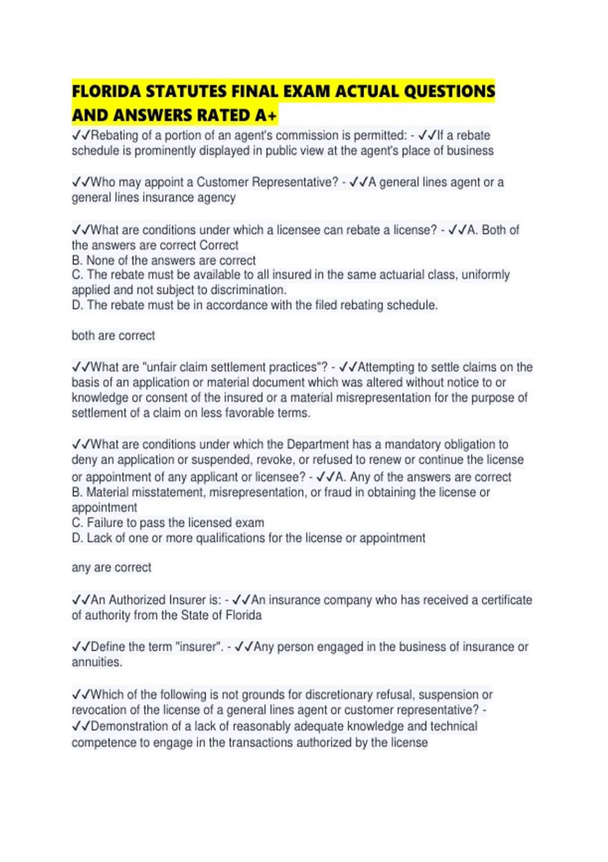 FLORIDA STATUTES FINAL EXAM ACTUAL QUESTIONS AND ANSWERS RATED A+