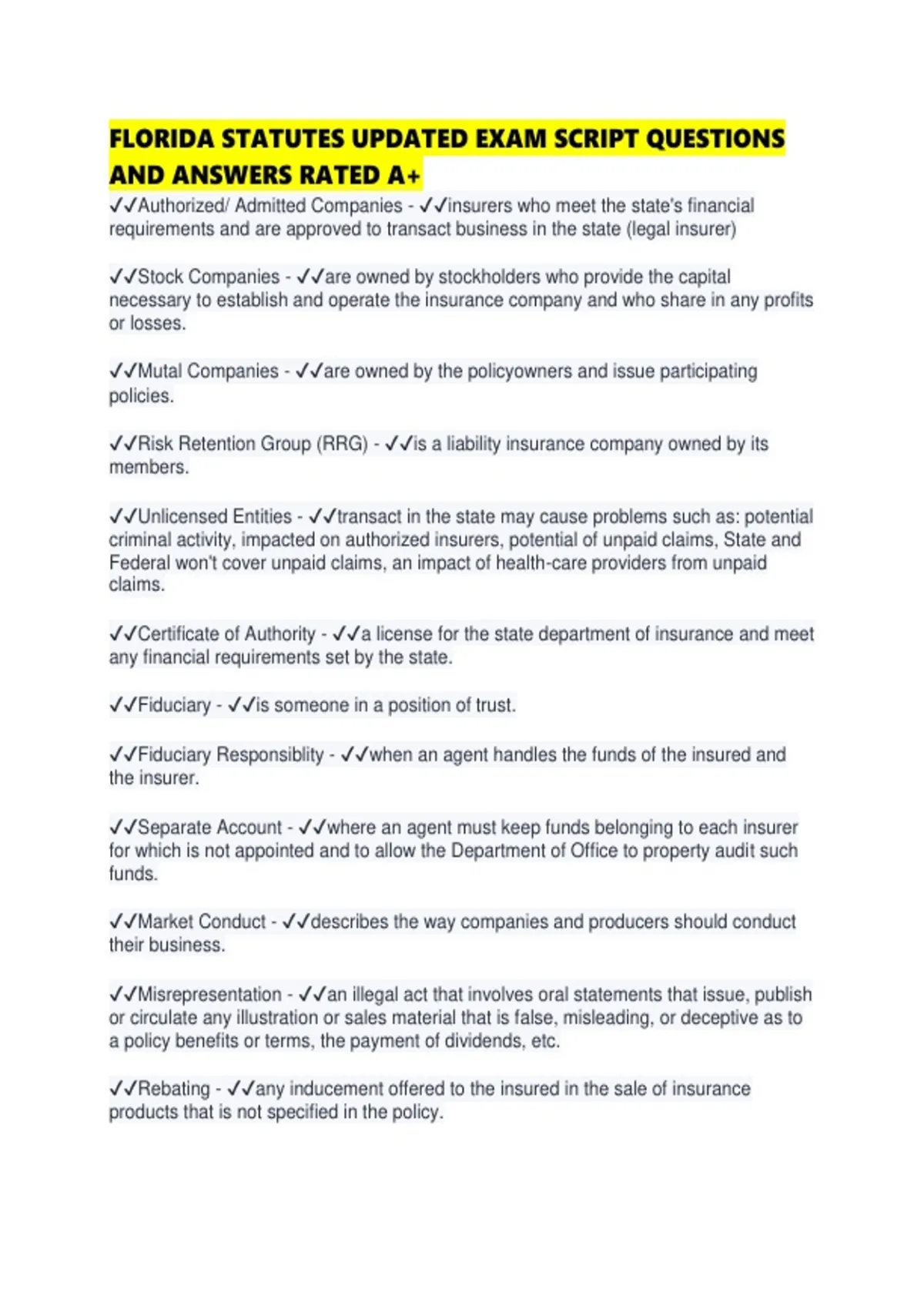 FLORIDA STATUTES UPDATED EXAM SCRIPT QUESTIONS AND ANSWERS RATED A+
