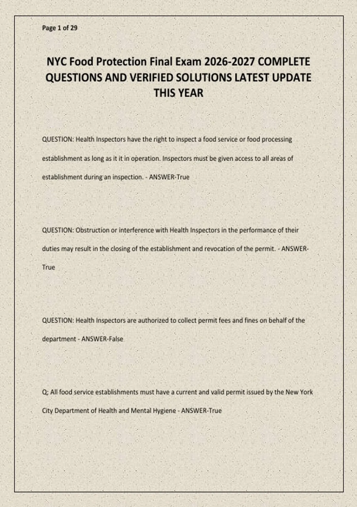 Tap on AVAILABLE IN BUNDLE / PACKAGE DEAL to unlock free bonus exams — save more while getting everything you need! You’ll be glad you did! The NYC Food Protection Final Exam 2026–2027 provides a fully updated and comprehensive study resource designed to help candidates master the New York City food protection certification examination. This in-depth guide covers all key topics, including food safety regulations, sanitation procedures, hazard analysis, temperature control, personal hygiene, cross-contamination prevention, inspection protocols, and scenario-based problem-solving. The complete question set includes verified solutions to reinforce understanding, strengthen retention, and build confidence for exam day. Ideal for food handlers, restaurant managers, and public health professionals preparing for the NYC Food Protection Final Exam, this resource ensures thorough review, practical practice, and reliable exam readiness.