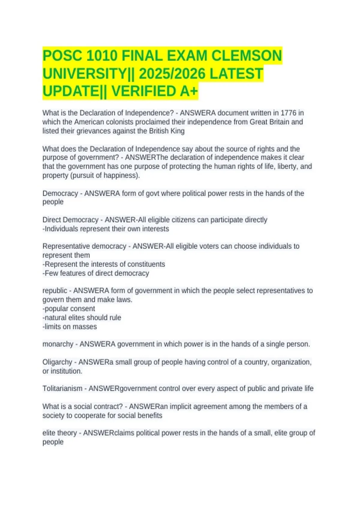 POSC 1010 FINAL EXAM CLEMSON UNIVERSITY|| 2025/2026 LATEST UPDATE|| VERIFIED A+