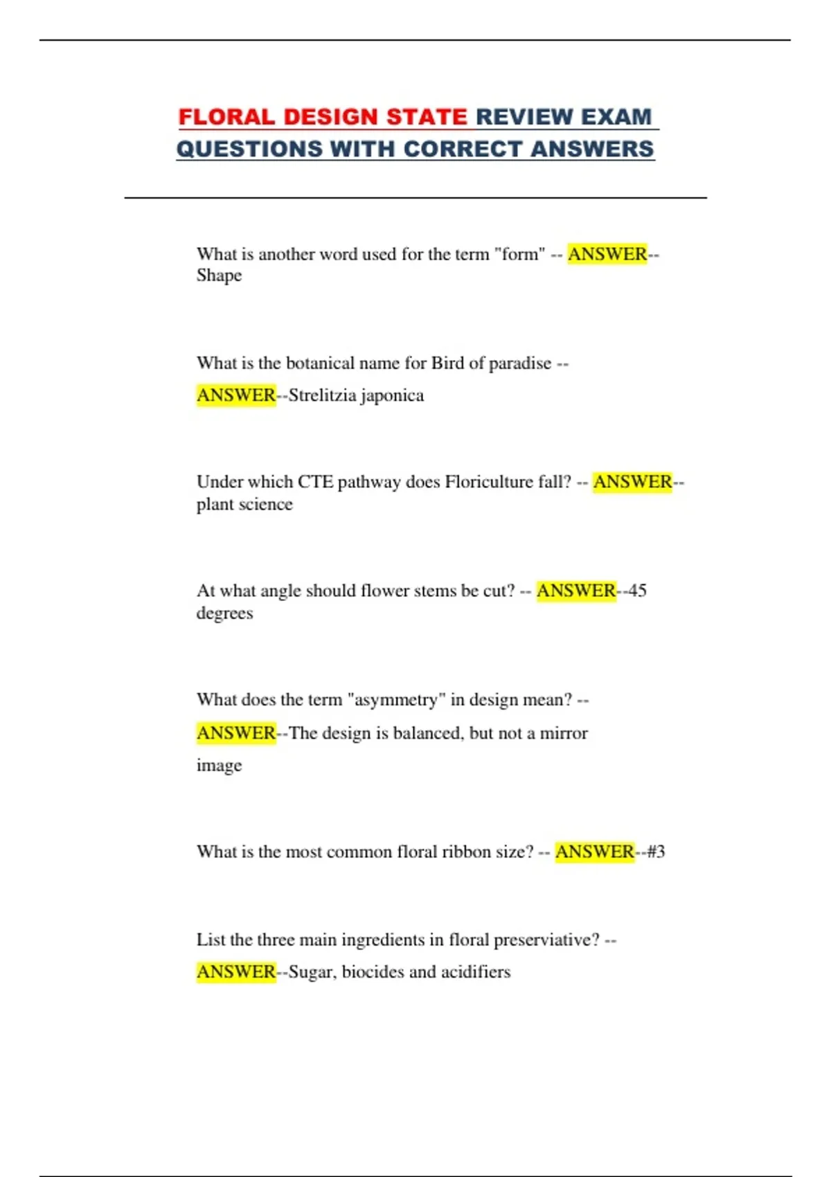 This document contains an extensive collection of review and state test questions with correct answers for Floral Design and Floriculture courses. It covers floral design principles, color theory, plant science, flower care and handling, business concepts, FFA knowledge, wiring techniques, design styles, and industry terminology, making it ideal for comprehensive exam preparation.