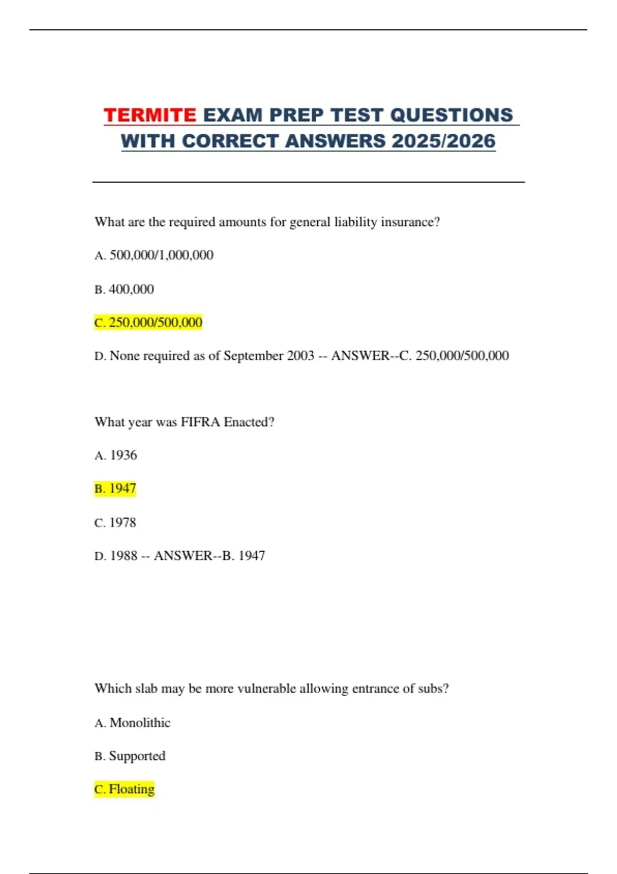 This document contains an extensive collection of termite and WDO exam preparation questions with correct answers, covering Florida termite regulations, inspections, treatments, pesticides, safety requirements, and identification of wood-destroying organisms. It is designed to help students and professionals prepare for termite licensing exams and WDO inspections for the 2025–2026 period. The material is suitable for revision, self-testing, and reinforcing key regulatory and technical knowledge required in Florida pest control exams.