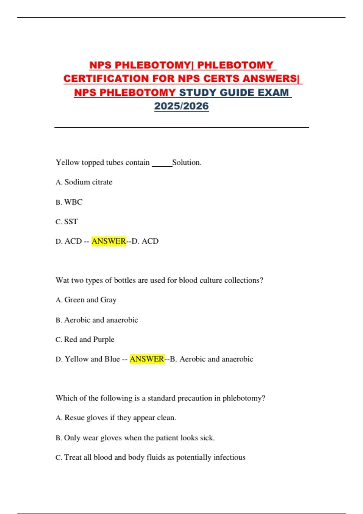NPS PHLEBOTOMY STUDY GUIDE EXAM
