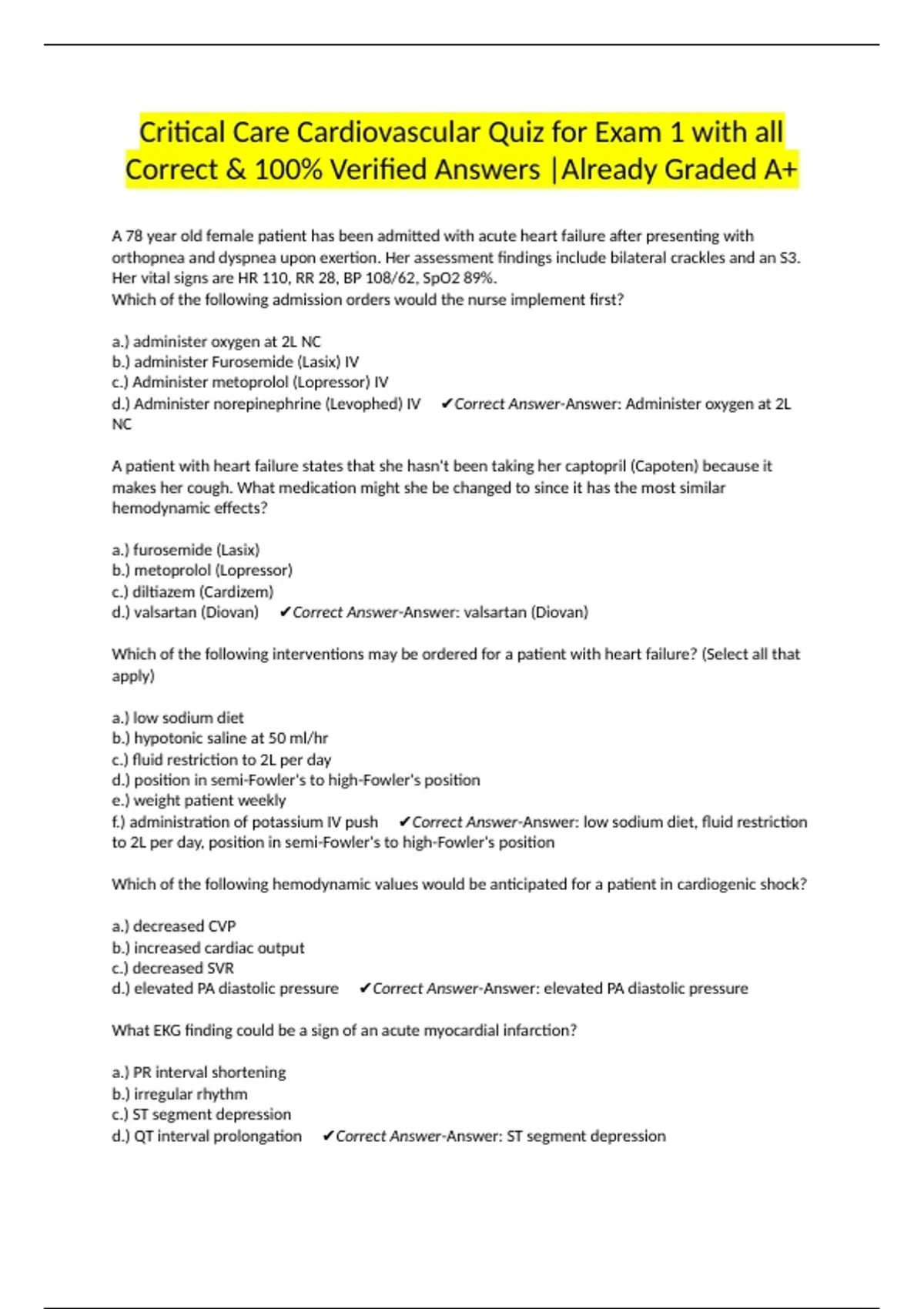 f.) administration of potassium IV push ✔Correct Answer-Answer: low sodium diet, fluid restriction