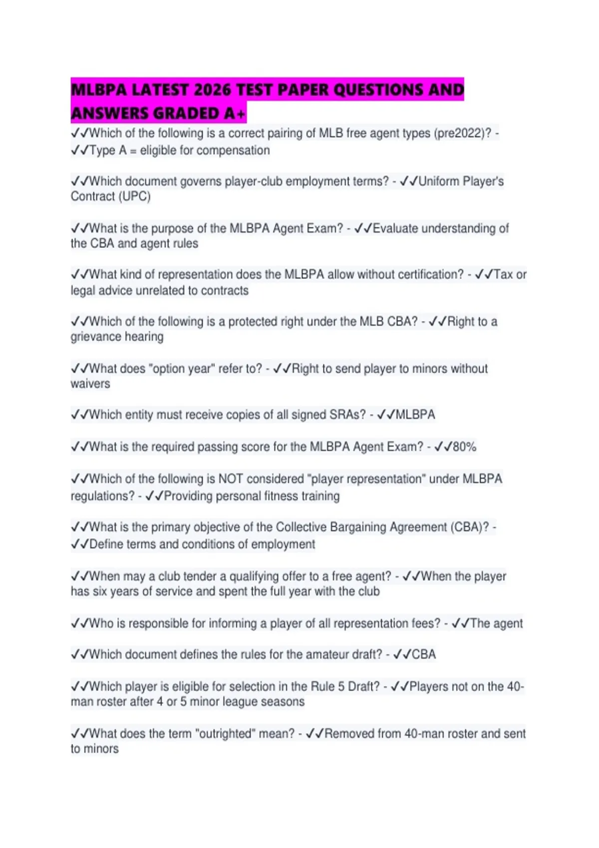 ✔✔What is the purpose of the MLBPA Agent Exam? - ✔✔Evaluate understanding of