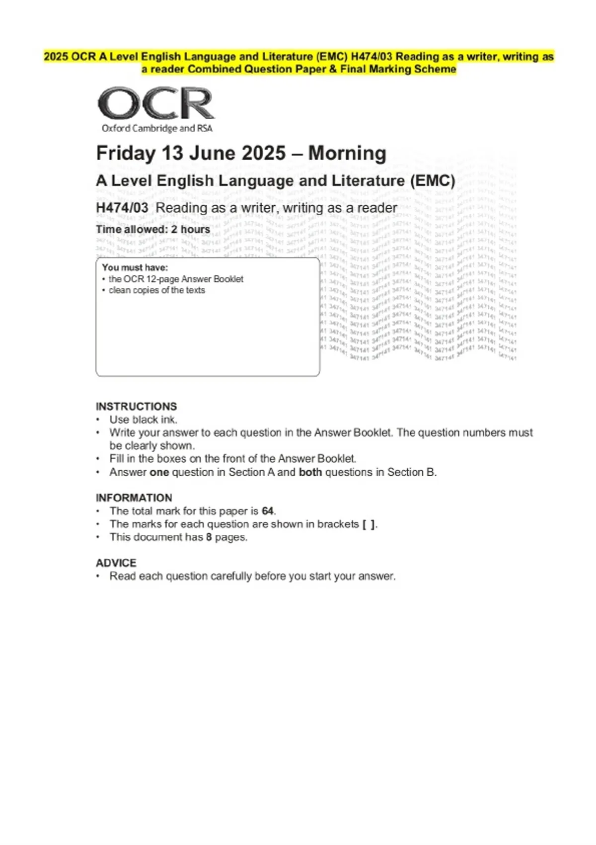 2025 OCR A Level English Language and Literature (EMC) H474/03 Reading as a writer, writing as a reader Question Paper and Final Evaluation Scheme