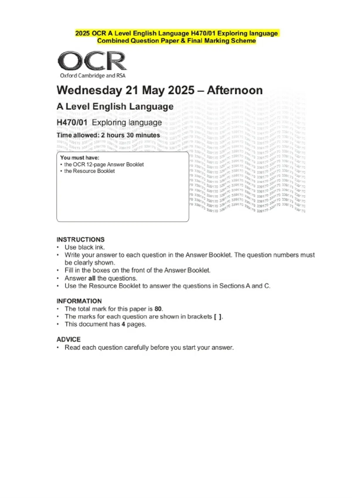 2025 OCR A Level English Language H470/01 Exploring language Question Paper and Final Evaluation Scheme