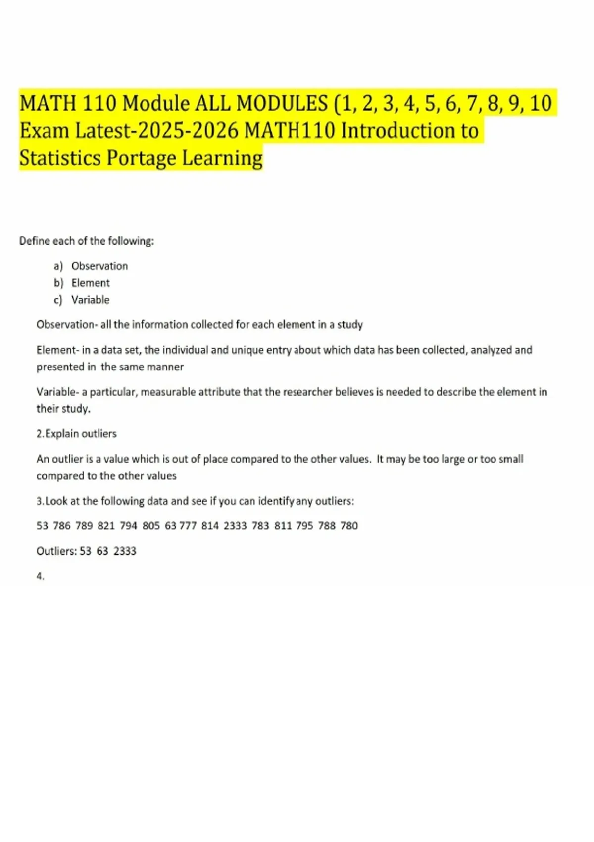 MATH 110 Module ALL MODULES (1, 2, 3, 4, 5, 6, 7, 8, 9, 10 Exam Latest- MATH110 Introduction to Statistics Portage Learning