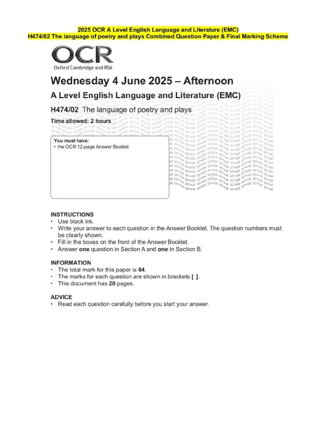 2025 OCR A Level English Language and Literature (EMC) H474/02 The language of poetry and plays Question Paper and Final Evaluation Scheme