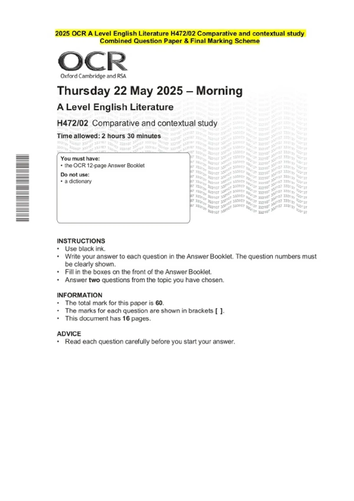 2025 OCR A Level English Literature H472/02 Comparative and contextual study Question Paper and Final Evaluation Scheme