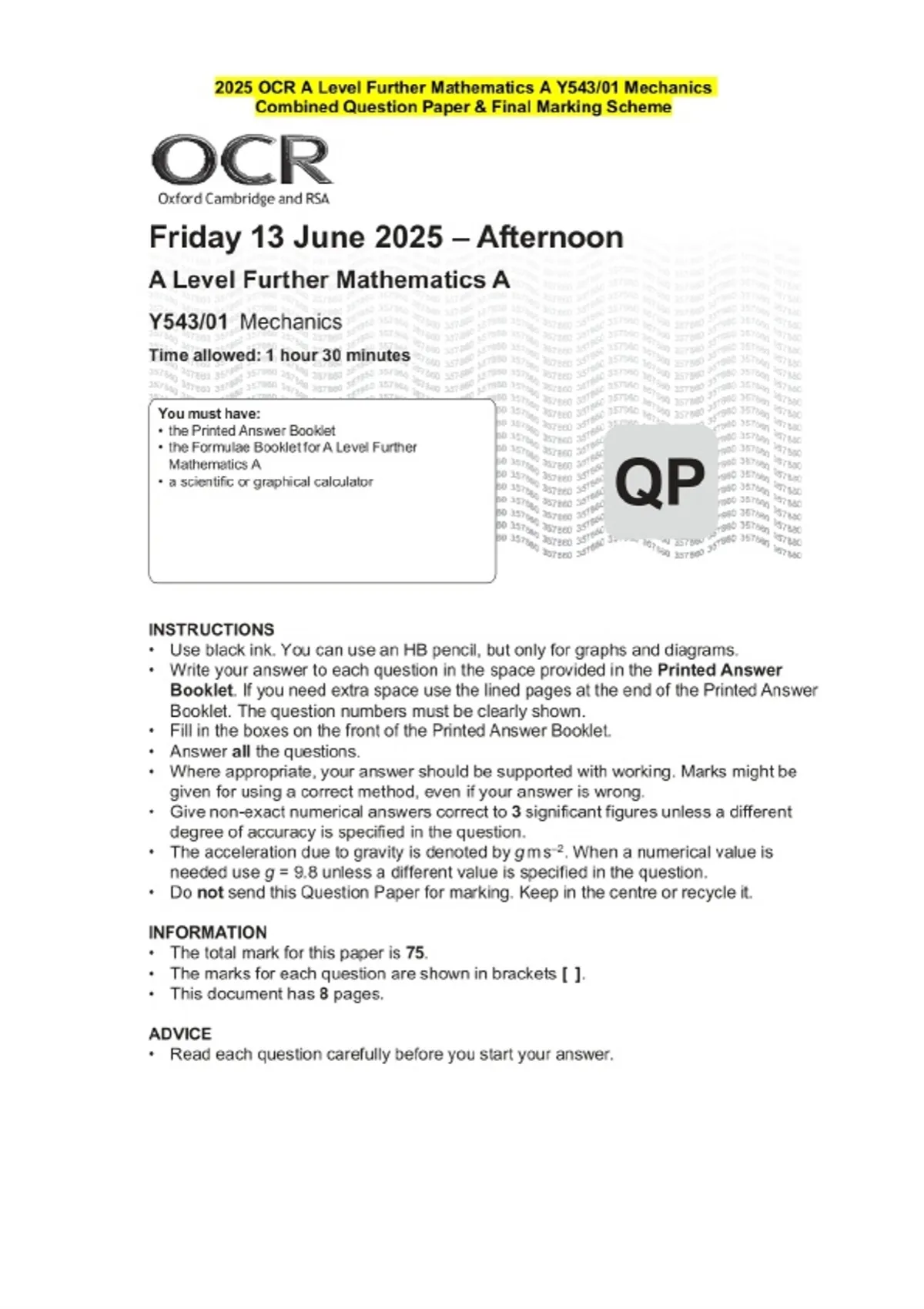 2025 OCR A Level Further Mathematics A Y543/01 Mechanics Question Paper and Final Evaluation Scheme