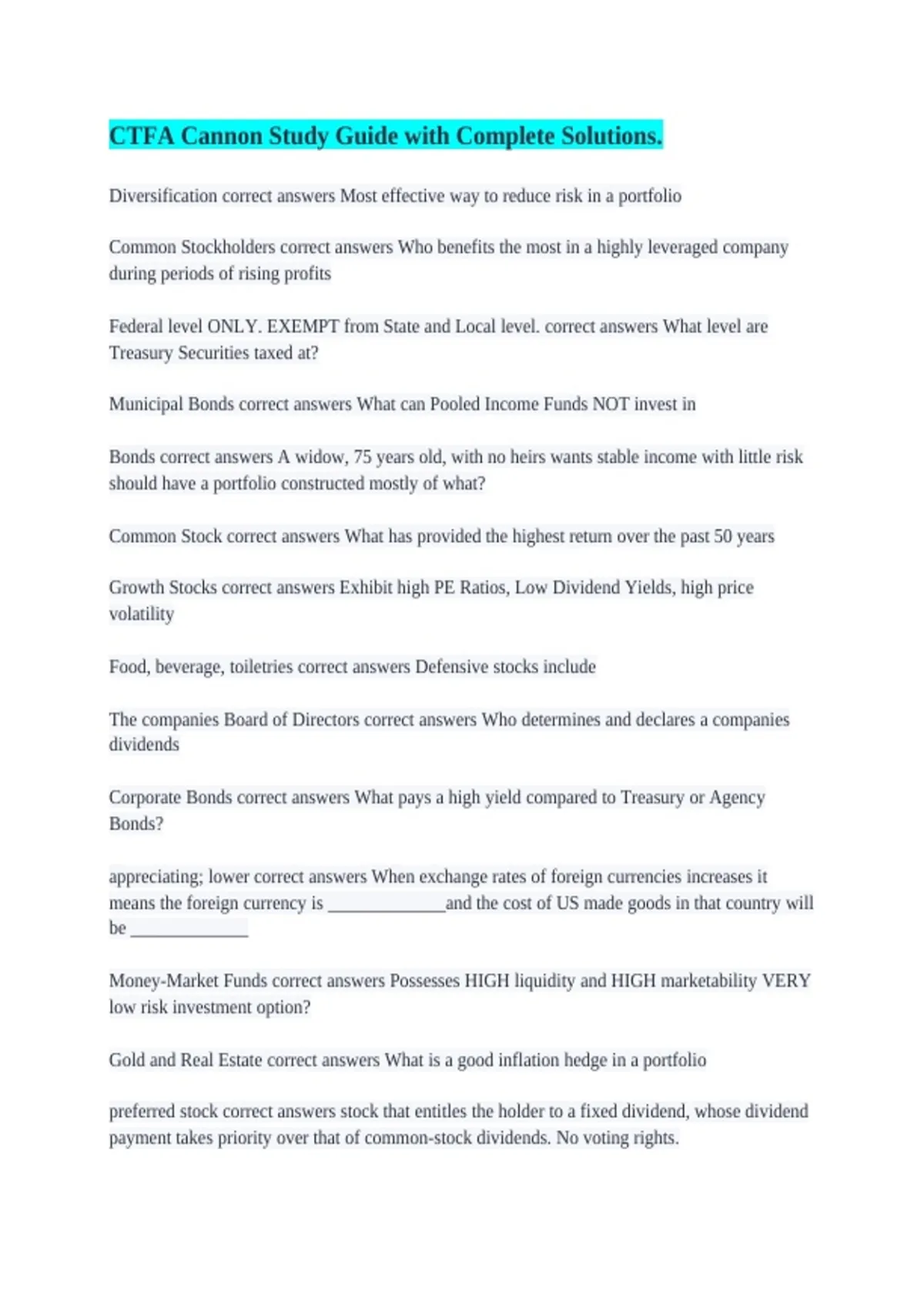 Cumulative Preferred Stock correct answers What kind of stock is entitled to dividends in