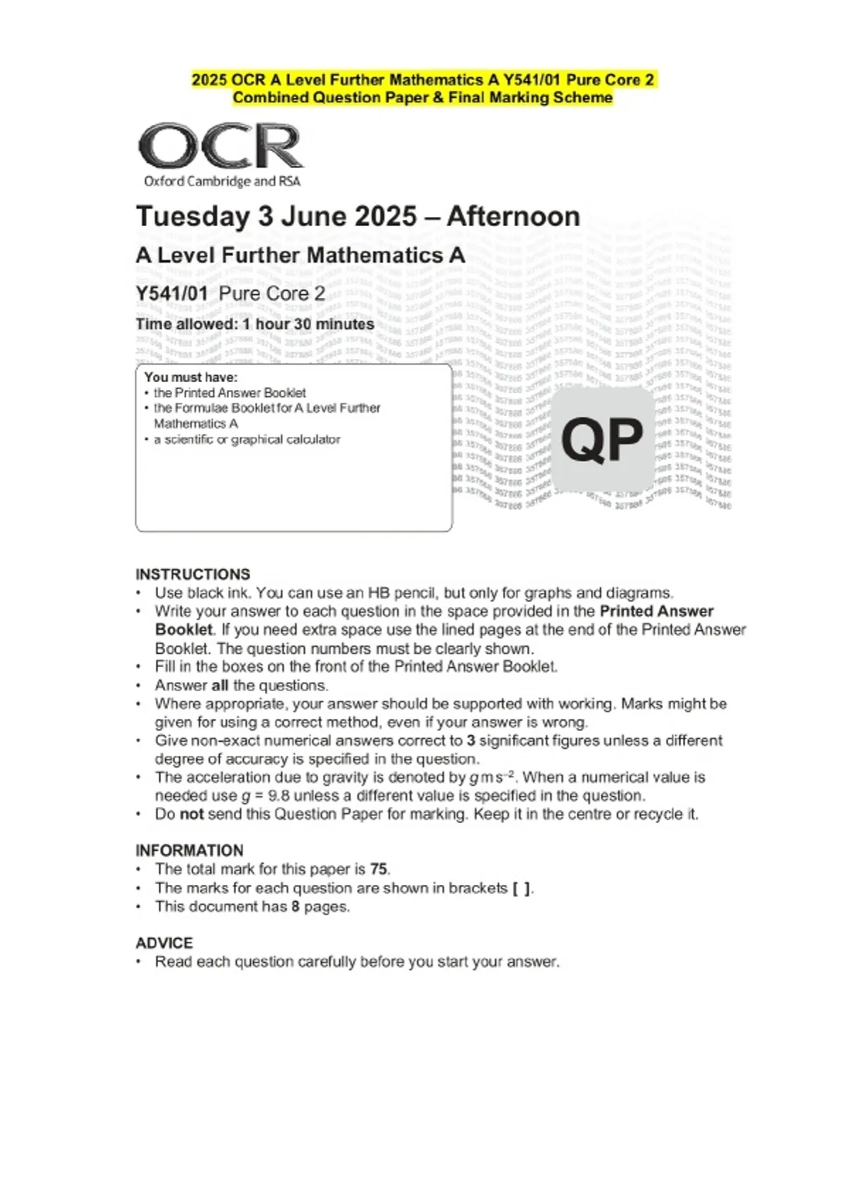 2025 OCR A Level Further Mathematics A Y541/01 Pure Core 2 Question Paper and Final Evaluation Scheme