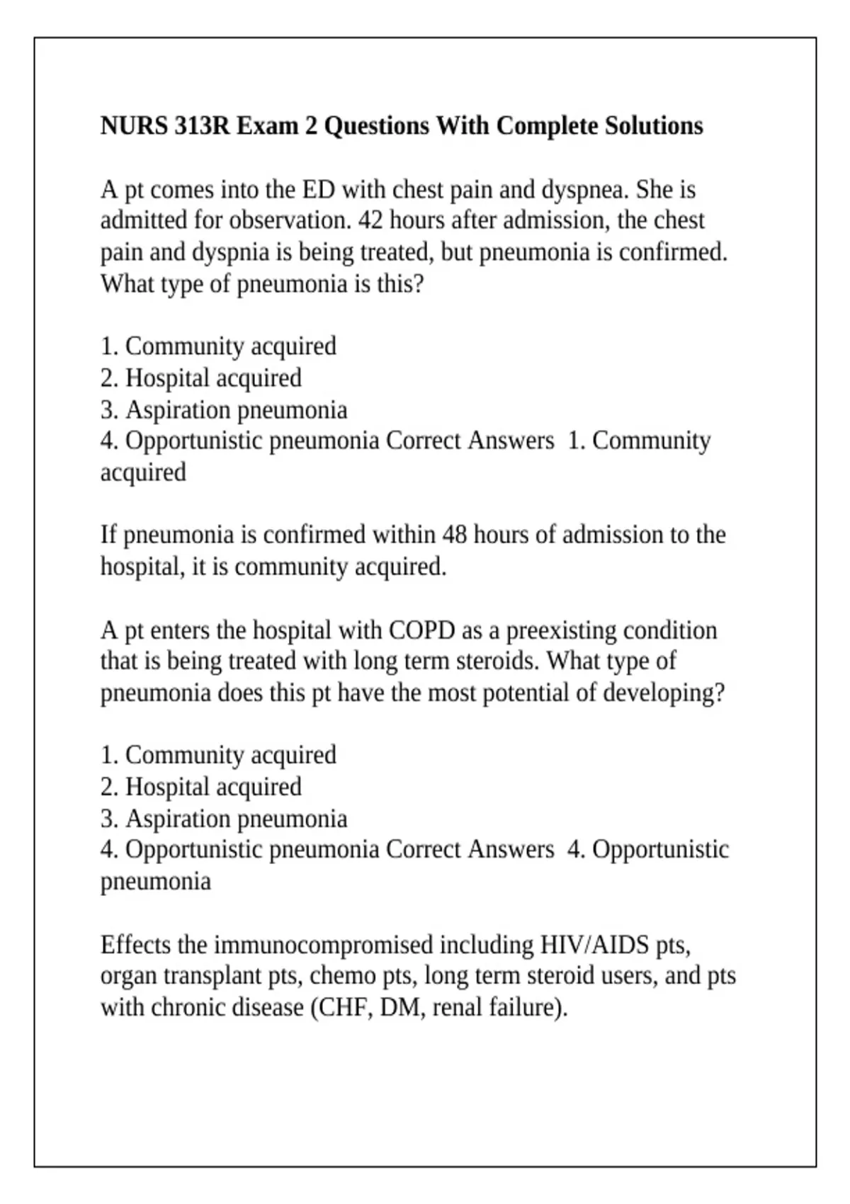 4. Opportunistic pneumonia Correct Answers 1. Community