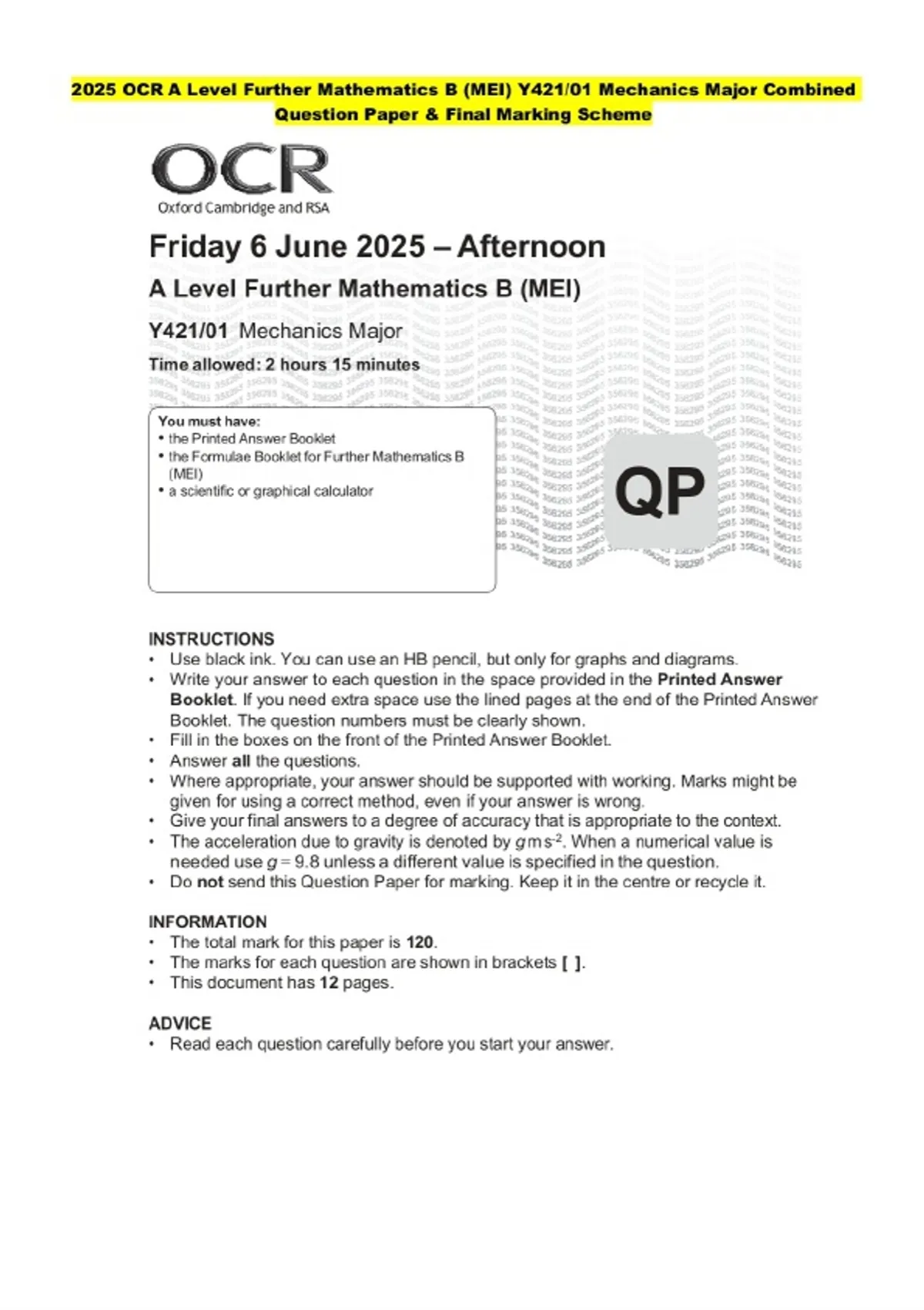 2025 OCR A Level Further Mathematics B (MEI) Y421/01 Mechanics Major Question Paper and Final Evaluation Scheme