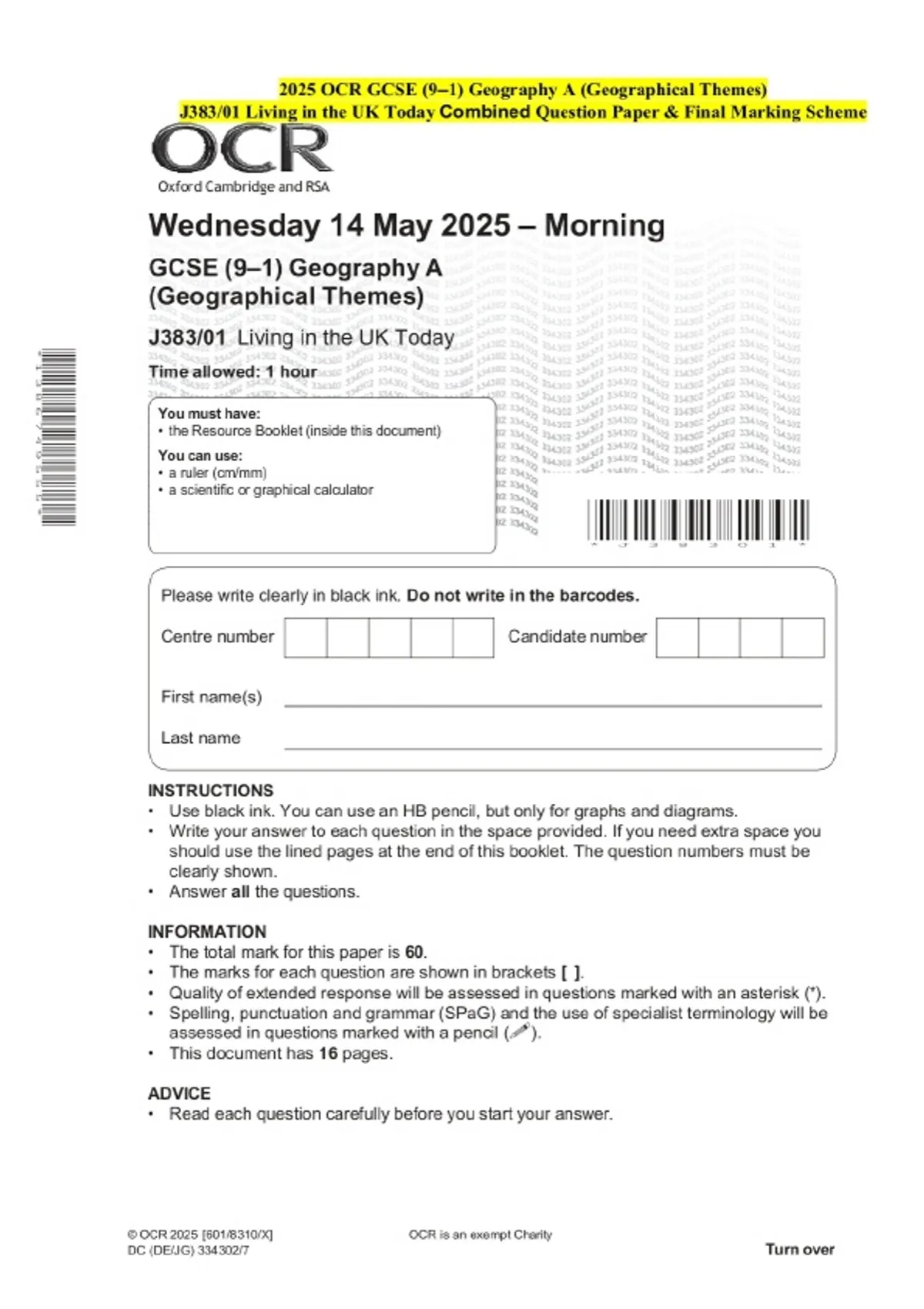 2025 OCR GCSE (9–1) Geography A (Geographical Themes) J383/01 Living in the UK Today Question Paper and Final Evaluation Scheme
