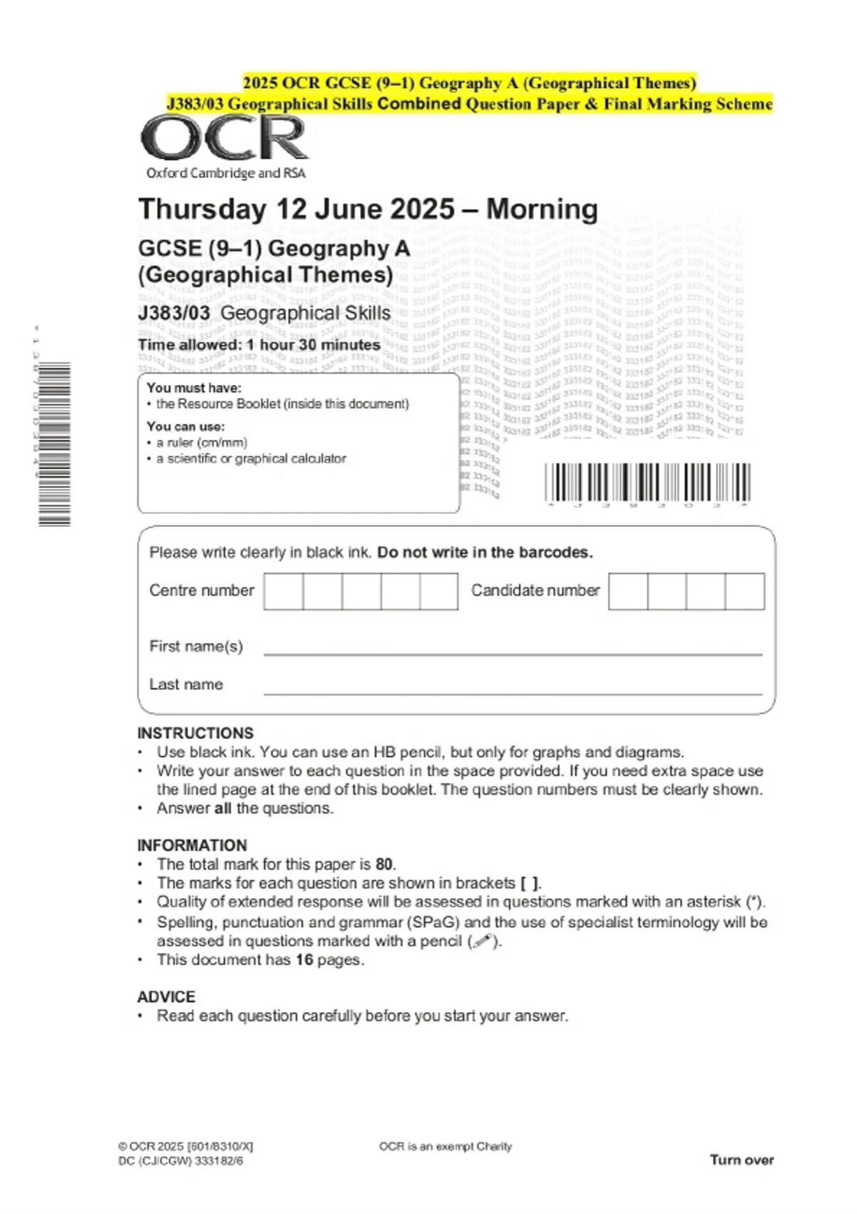 2025 OCR GCSE (9–1) Geography A (Geographical Themes) J383/03 Geographical Skills Question Paper and Final Evaluation Scheme