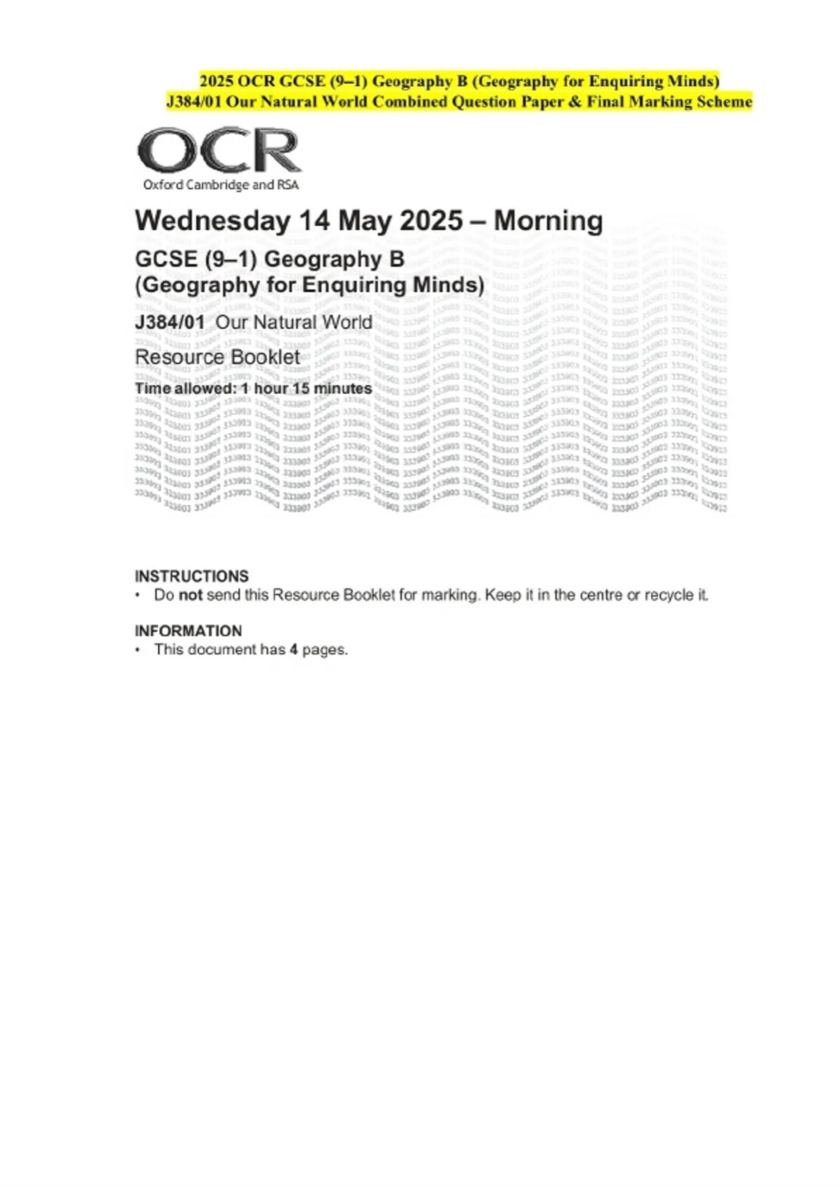2025 OCR GCSE (9–1) Geography B (Geography for Enquiring Minds)J384/01 Our Natural World Question Paper and Final Evaluation Scheme
