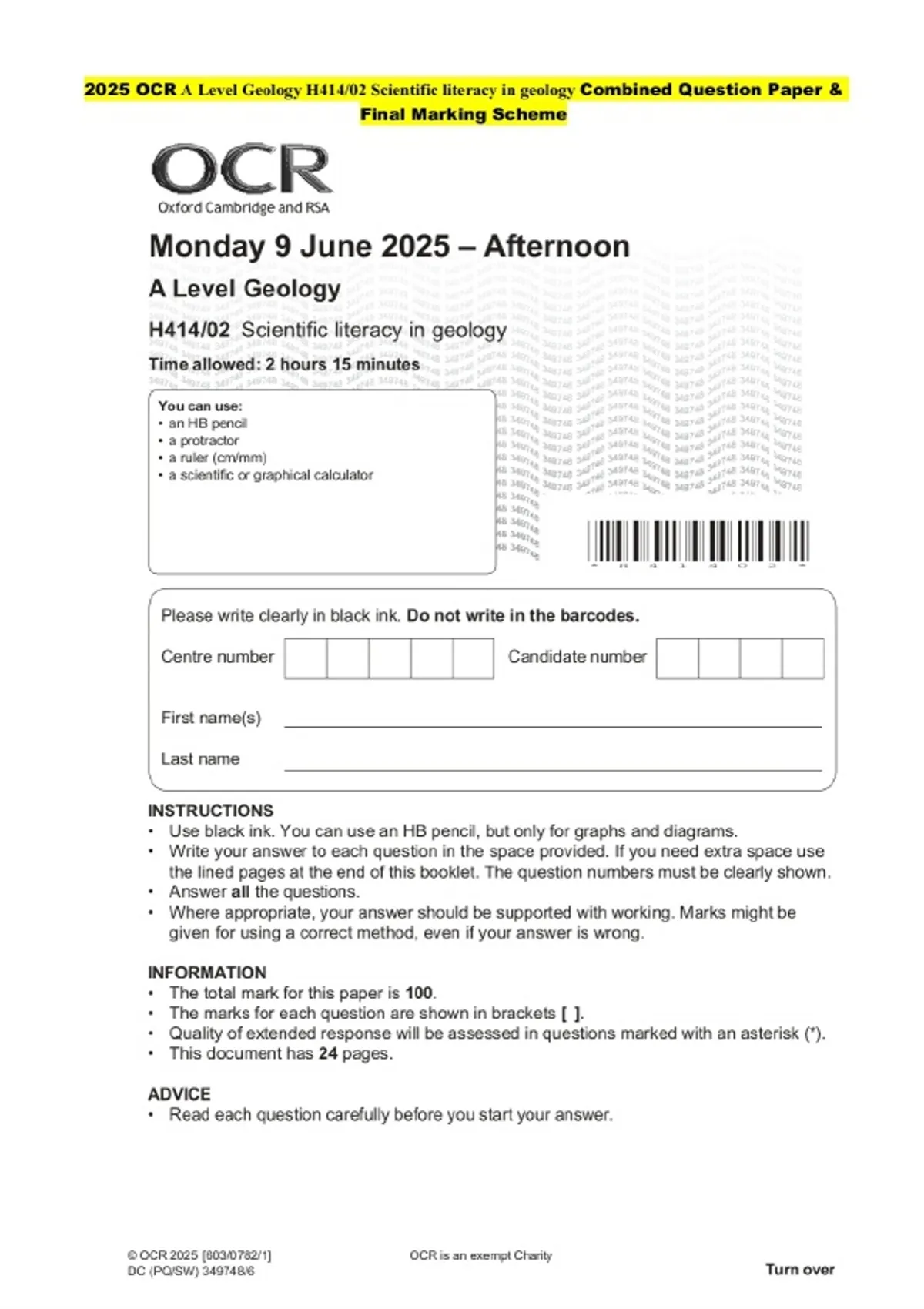 2025 OCR A Level Geology H414/02 Scientific literacy in geology Question Paper and Final Evaluation Scheme