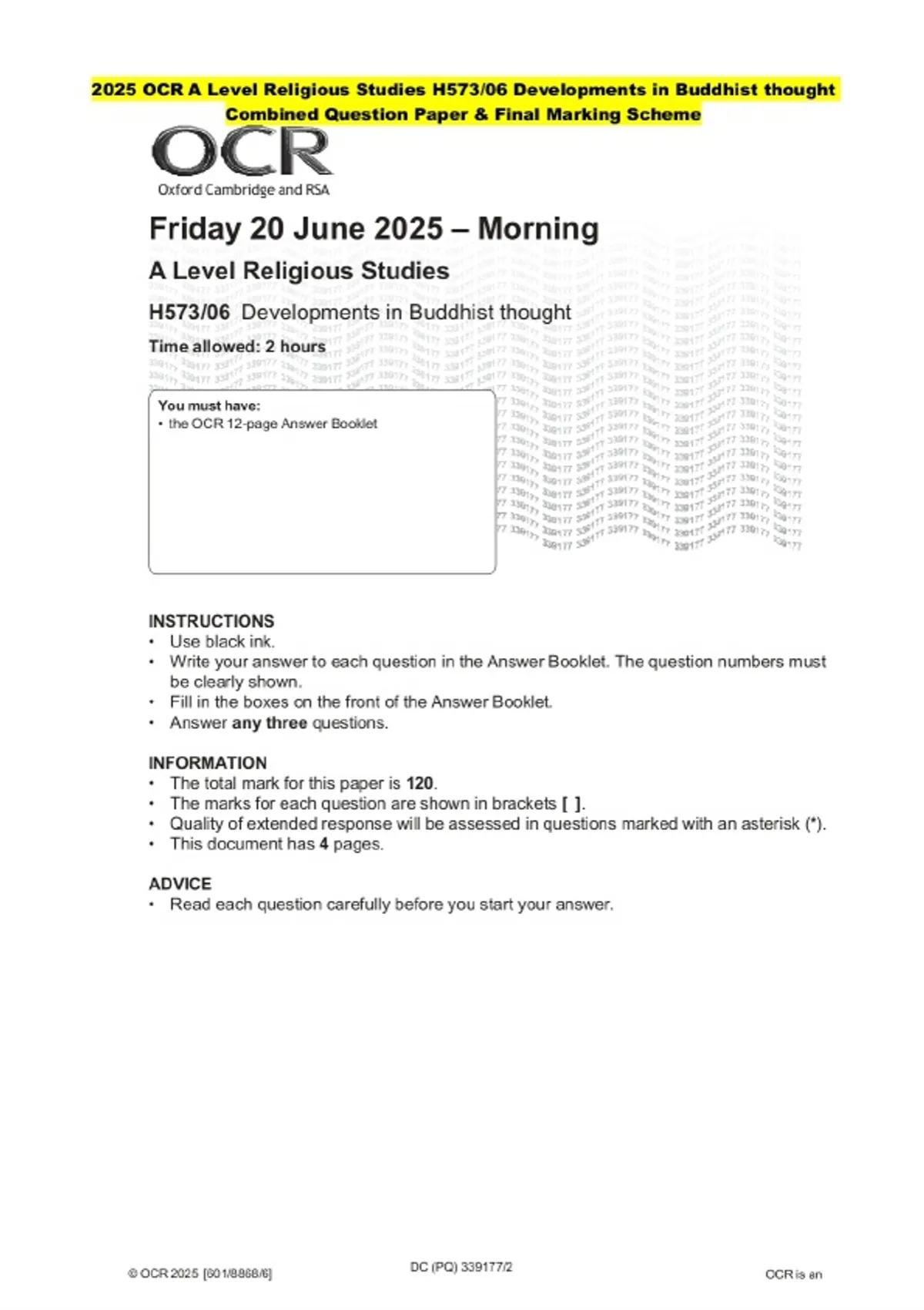 2025 OCR A Level Religious Studies H573/06 Developments in Buddhist thought Combined Exam paper along with marking scheme