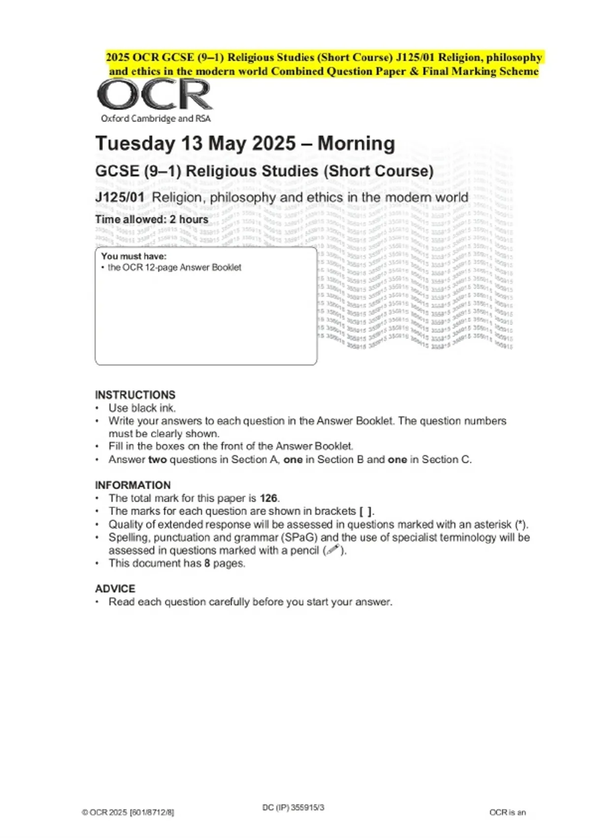 2025 OCR GCSE (9–1) Religious Studies (Short Course) J125/01 Religion, philosophy and ethics in the modern world Combined Exam paper along with marking scheme