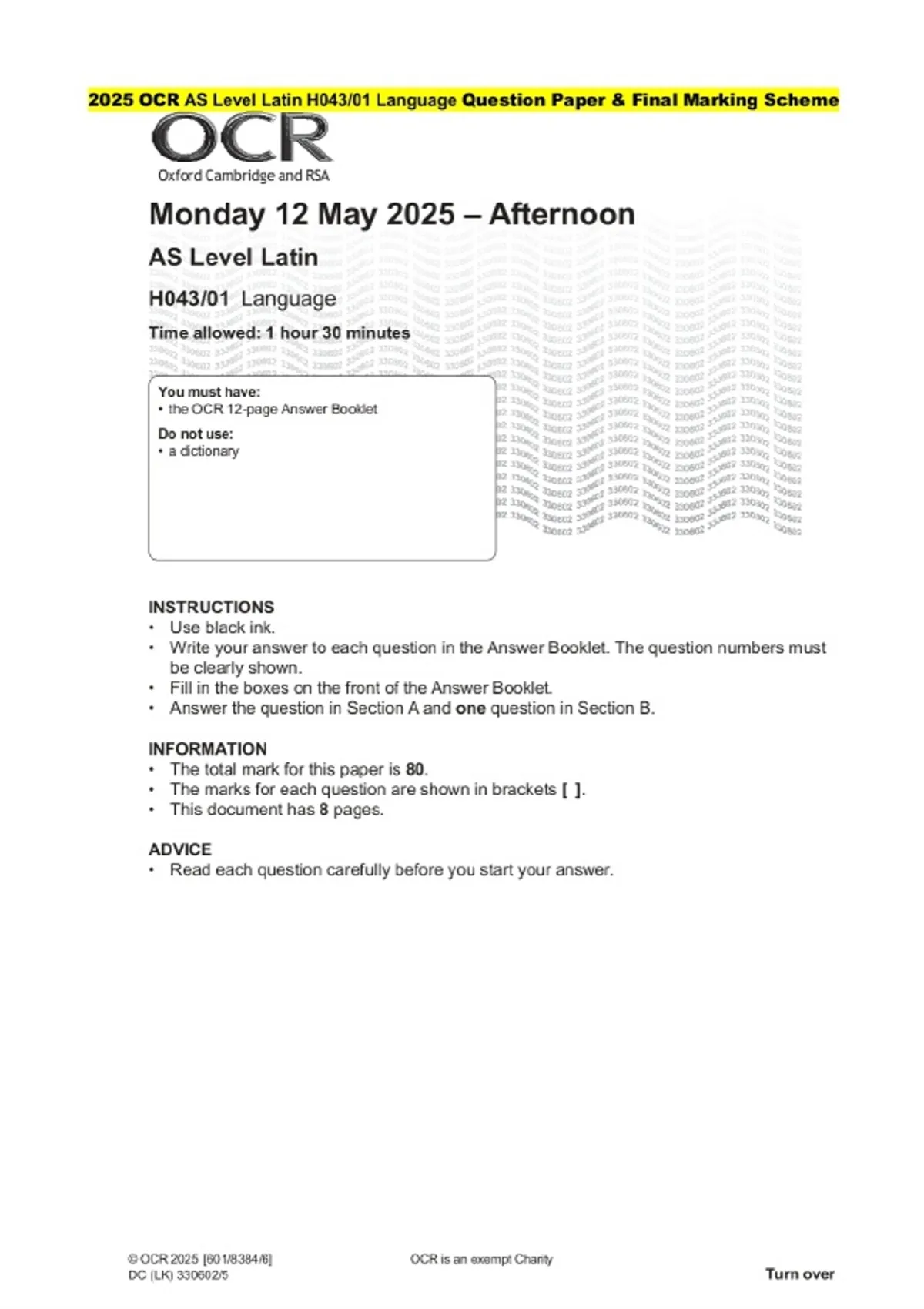 2025 OCR AS Level Latin H043/01 Language Question Paper and Final Evaluation Scheme