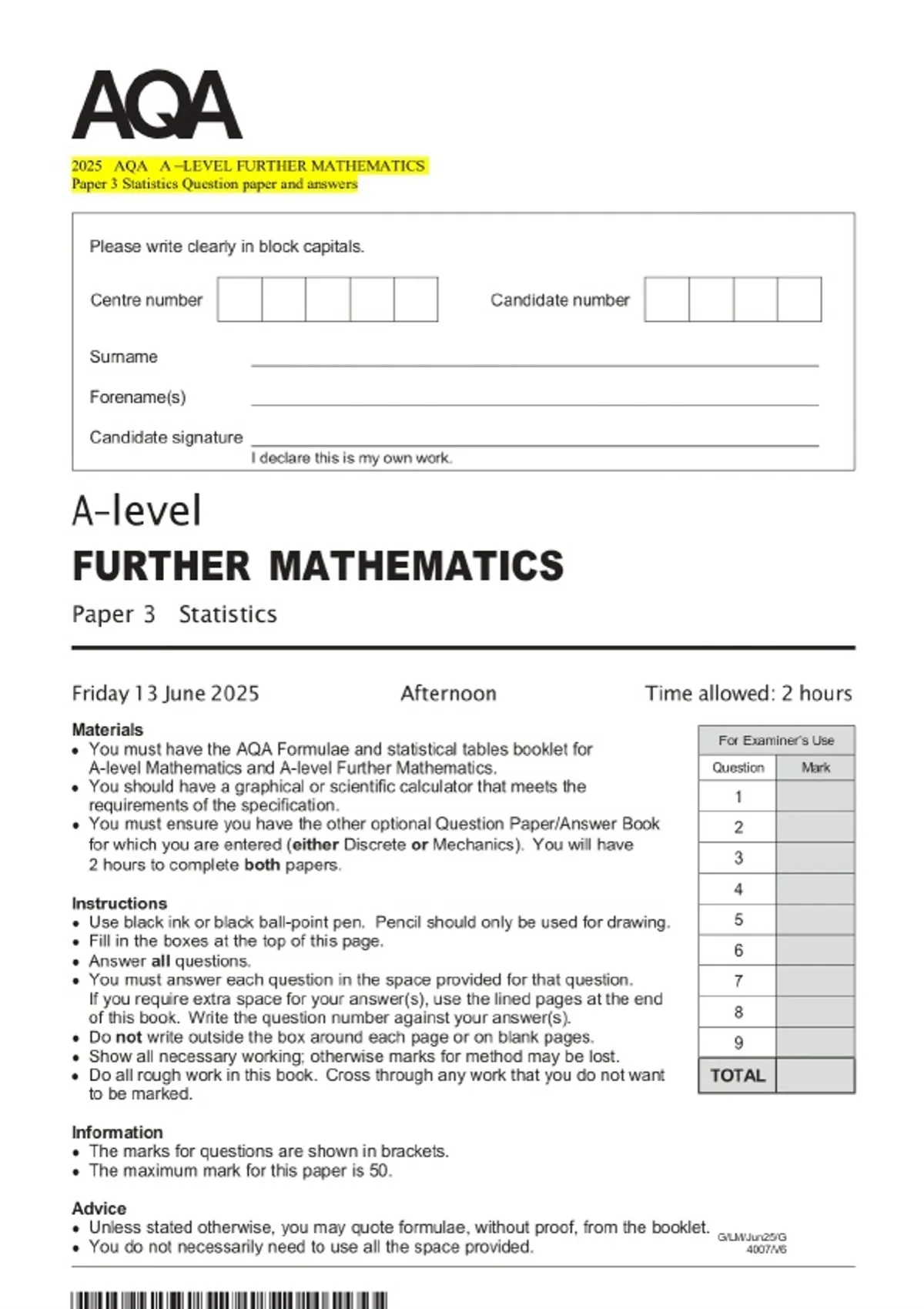2025 AQA A –LEVEL FURTHER MATHEMATICS Paper 3 Statistics Exam paper along with marking scheme