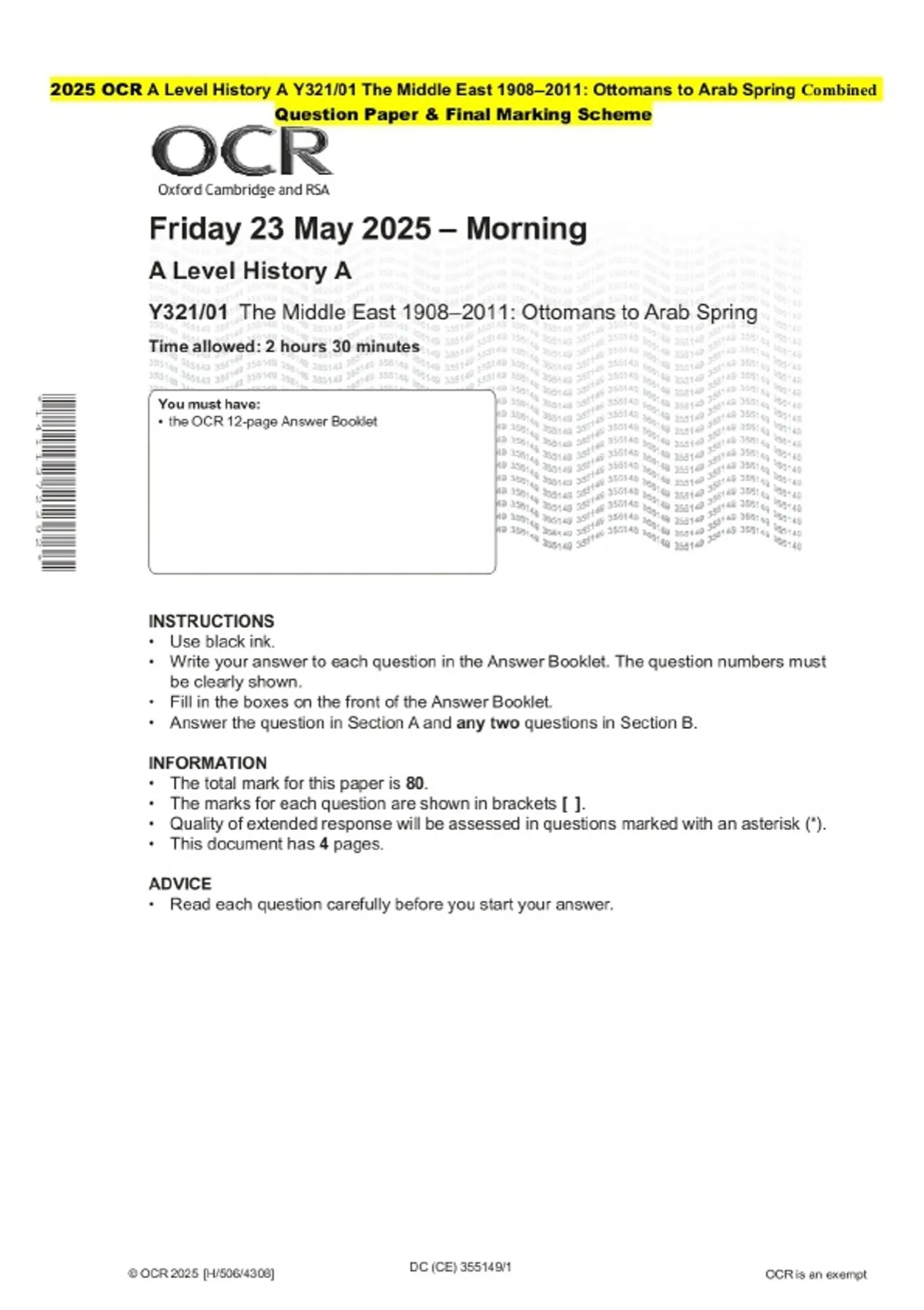 2025 OCR A Level History A Y321/01 The Middle East 1908–2011: Ottomans to Arab Spring Combined Exam paper along with marking scheme