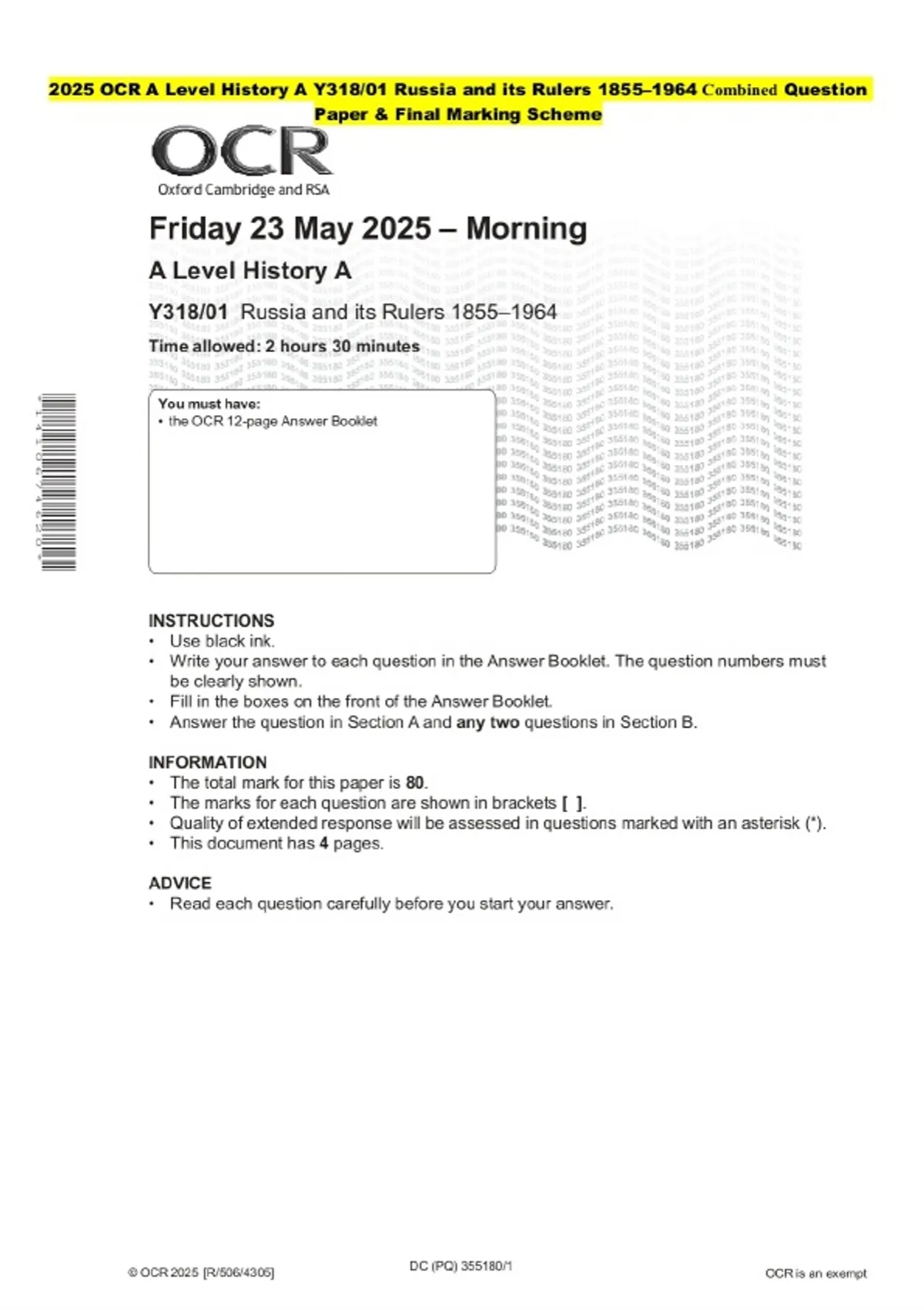 2025 OCR A Level History A Y318/01 Russia and its Rulers 1855–1964 Combined Exam paper along with marking scheme