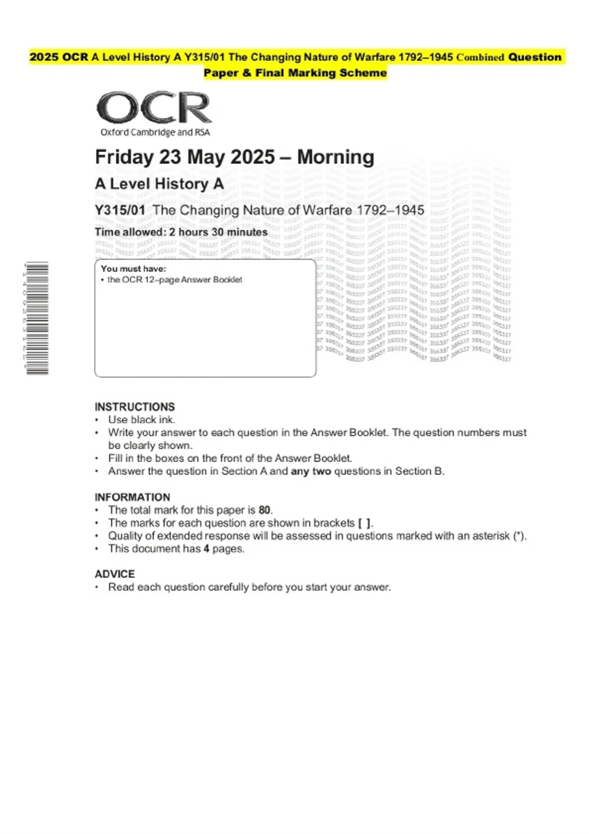 2025 OCR A Level History A Y315/01 The Changing Nature of Warfare 1792–1945 Combined Exam paper along with marking scheme
