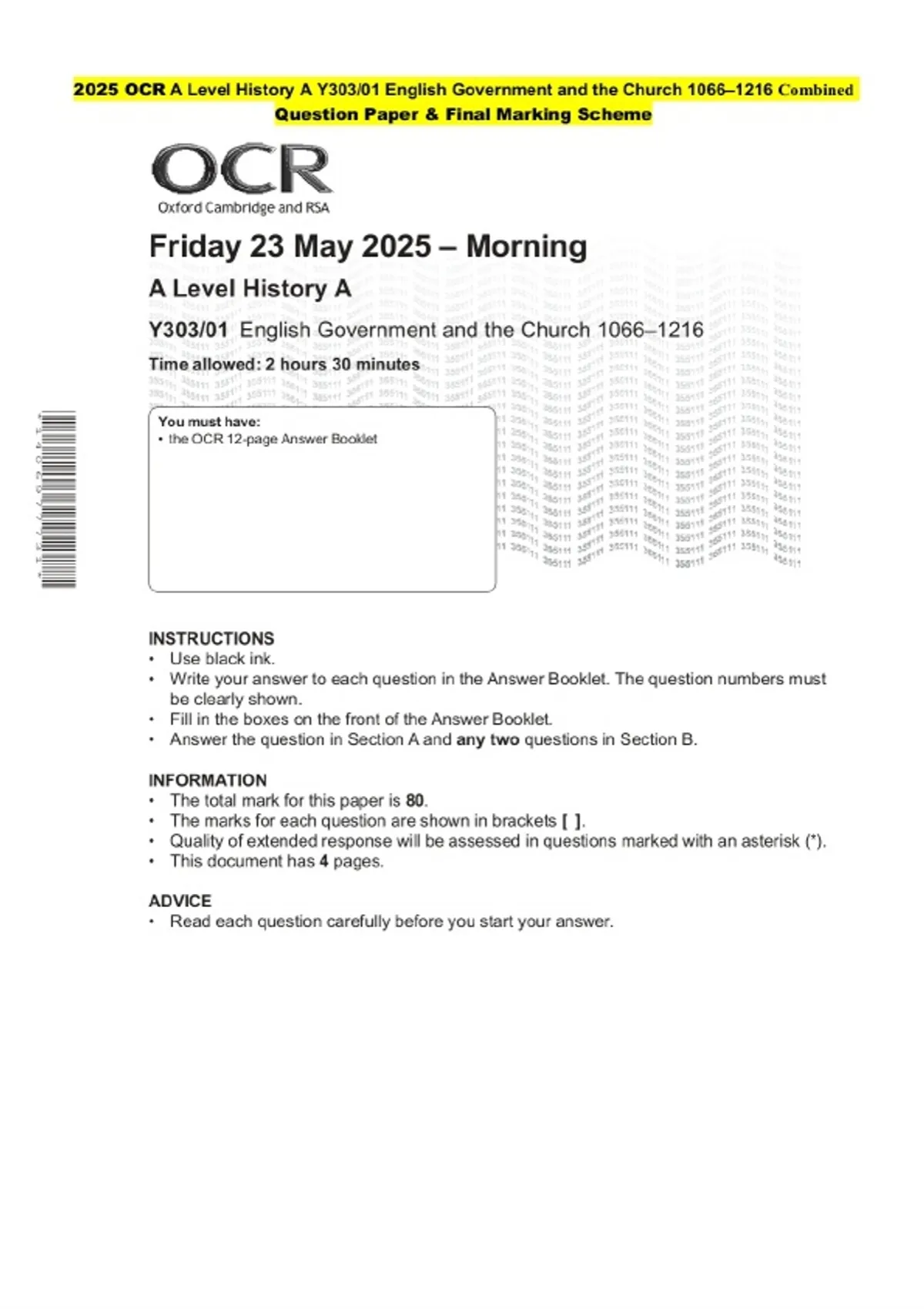 2025 OCR A Level History A Y303/01 English Government and the Church 1066–1216 Combined Exam paper along with marking scheme